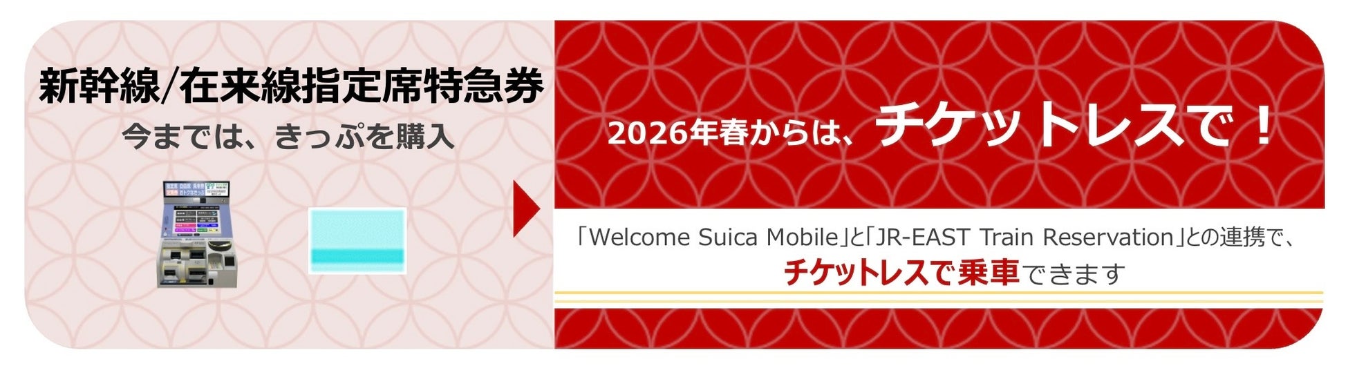 2026年春を目標に、「Welcome Suica Mobile」と「JR-EAST Train Reservation」を連携し、JR東日本の新幹線や在来線の指定席も入国前※に購入しチケットレスでご利用いただけるよう開発を進めています。なお、「JR-EAST Train Reservation」は、JR東日本の運営する訪日外国人向けにきっぷや鉄道パスを発売するウェブサイトです。https://www.eki-net.com/en/jreast-train-reservation/Top/Index