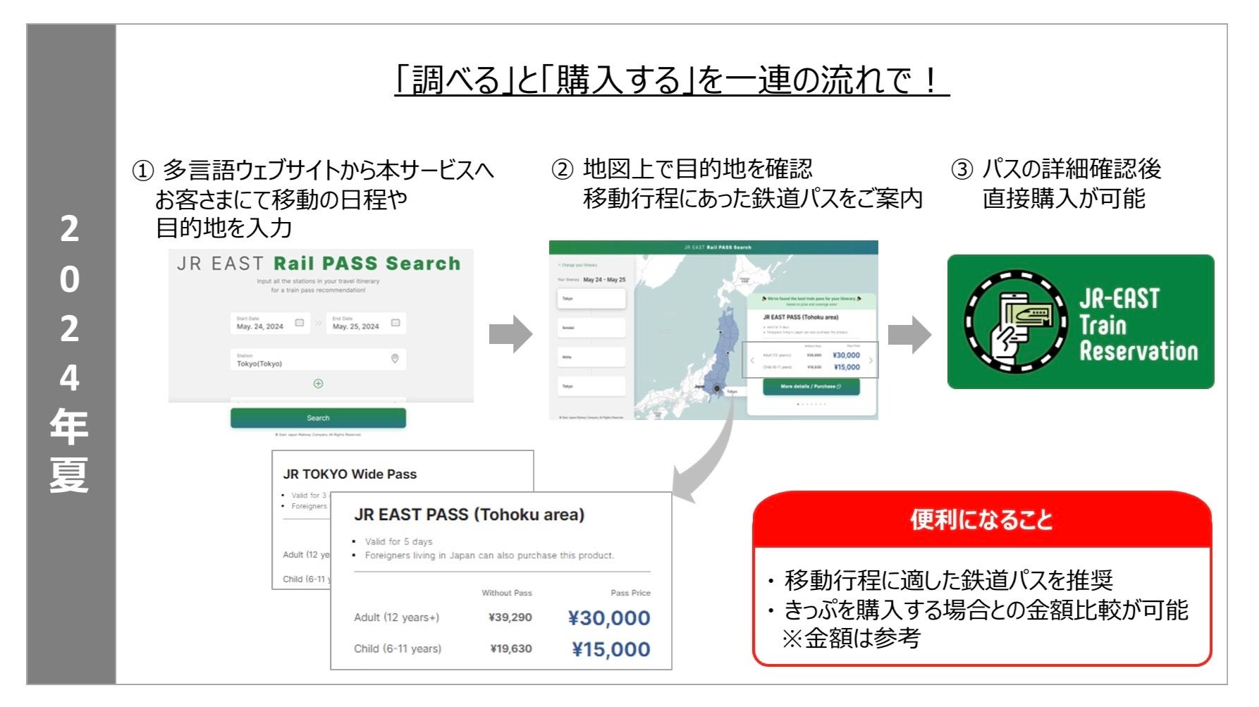 お客さまが滞在中の移動目的や行程に合わせてJR東日本が販売する訪日外国人向けの鉄道パスをスムーズに購入できるよう、「JR EAST Rail PASS Search」を2024年夏にリリースします。