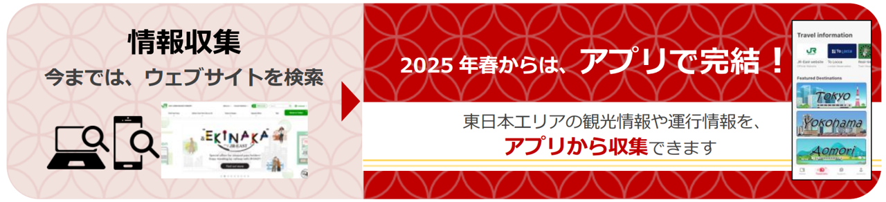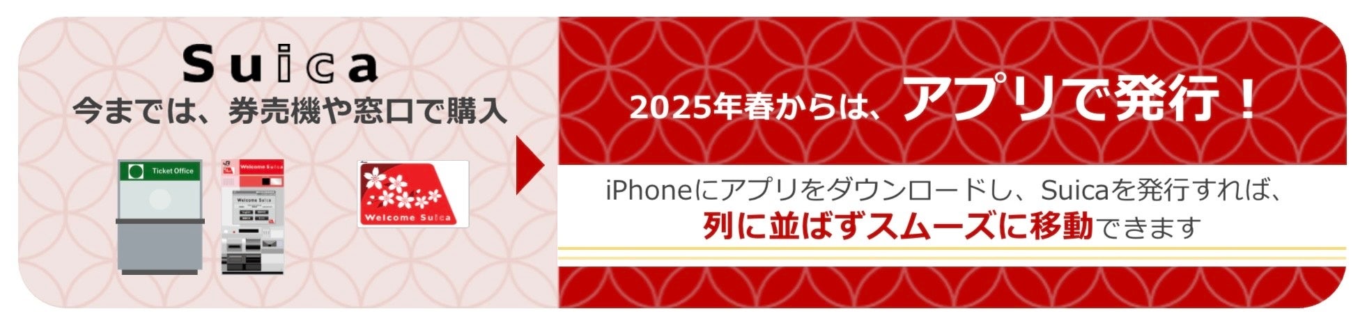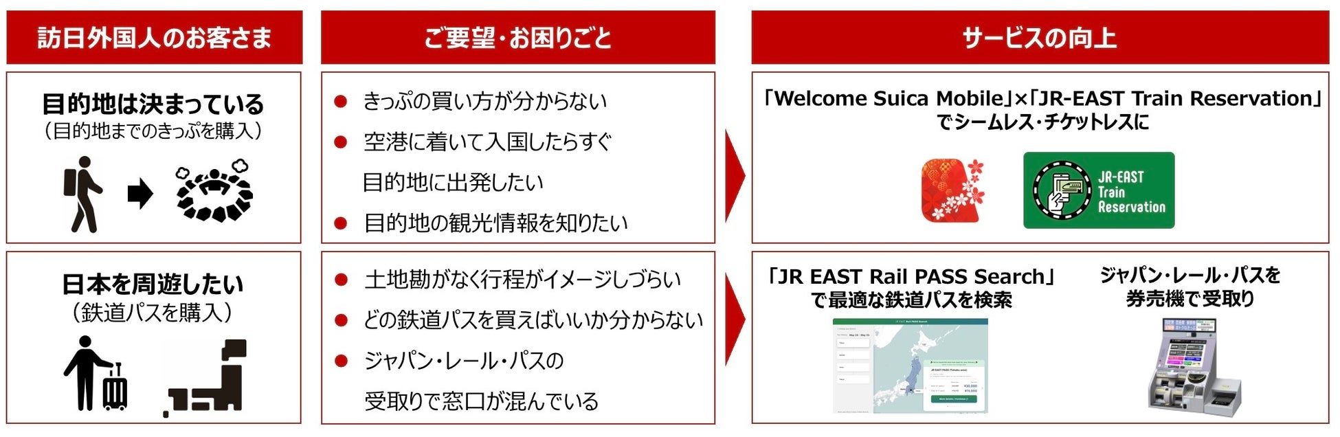 〇JR東日本では、訪日外国人にJR東日本の新幹線や特急列車をシームレスにご利用いただけるようチケッティングサービスを拡充し、利便性を向上させていきます。 〇「Welcome Suica Mobile」アプリを2025年春にリリースします。窓口や券売機に立ち寄ることなく、入国前のアプリ操作のみでSuica発行やチャージなどができ、入国後スムーズに鉄道をはじめとした交通機関やお買い物にご利用いただけるようになります。 〇「JR EAST Rail PASS Search」を2024年夏にリリースします。従来はご移動の行程に合う鉄道パスを調べる必要がありましたが、JR東日本の多言語ウェブサイトよりご移動の行程・目的地を入力することで、行程などに合わせたJR東日本エリアの鉄道パスをご案内します。 〇窓口に並ばずにジャパン・レール・パスを受取れる仕組みについて、2026年春を目途に導入し、窓口の混雑解消を目指します。 |