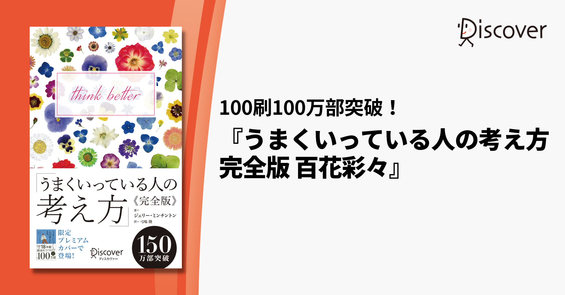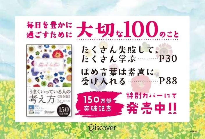 株式会社ディスカヴァー・トゥエンティワン(本社:東京都千代田区、取締役社長:谷口奈緒美)は2022年5月15日に『うまくいっている人の考え方 完全版 プレミアムカバー 百花彩々』(ジェリー・ミンチントン 著、弓場隆 訳)を刊行しました。本書は、『うまくいっている人の考え方 完全版』の100刷100万部突破を記念した限定カバーです。これにより、シリーズ累計で150万部突破となりました。