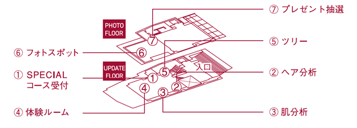 UPDATE FLOORの入り口付近には3本のツリーが並びます。ツリーを彩るのは、様々な形のオーナメント。ビューティケアにご満足いただけたら、声の代わりにオーナメントを飾れるしくみです。ご来場の皆様の声で、ビューティツリーができあがっていきます。みんなの声にパワーをもらいながら、自分も声を重ねることで、みんなで美のアップデートを盛り上げていきます。
