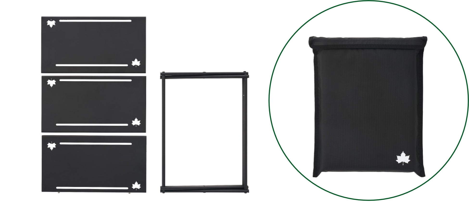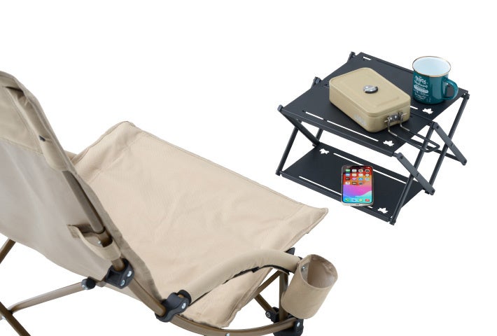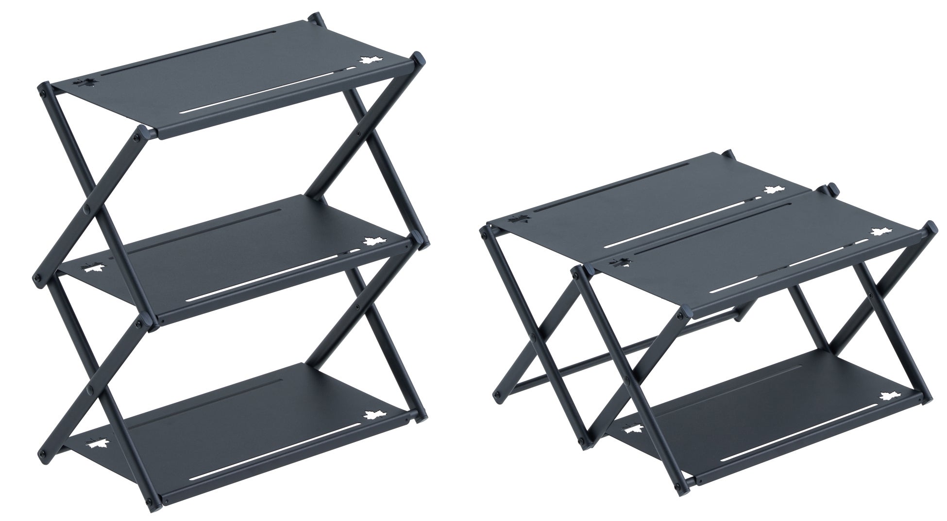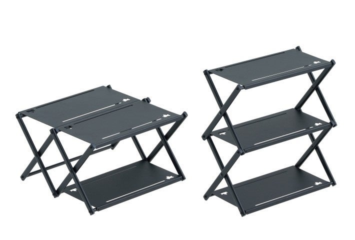 2段もしくは3段にカスタムできるフレームと3枚の天板で構成されており、ソロでもファミリーでも活躍する3段ラックや、あぐらチェアなどのローチェアにぴったりなサイドテーブルに、シーンに合わせてカスタムが可能です。