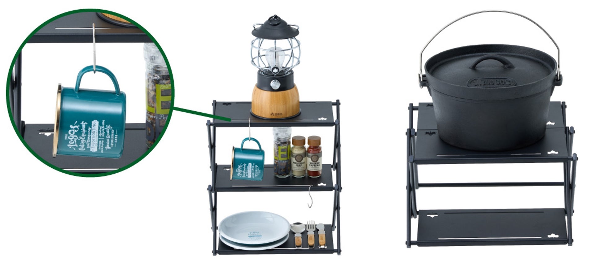 天板はスチール製の耐熱天板なので、テーブルとして使用する場合は、熱々のダッチオーブンやスキレットも直置きができて便利です。また、天板にスリットが入っているため、ラックとして使用する場合は、市販のS字フックを使用するとコップなど小物の吊り下げ収納も可能です。
