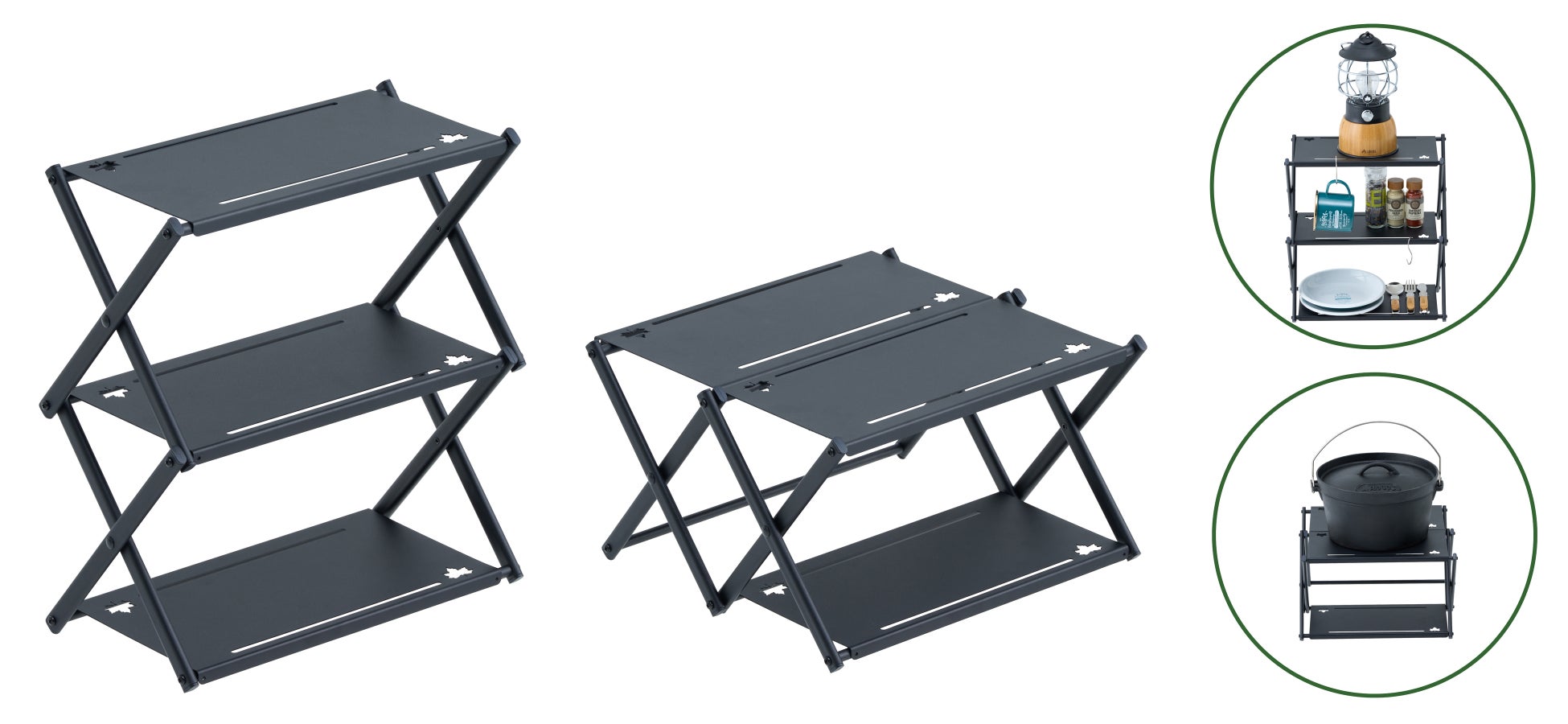 用途に合わせてラックとテーブルの使い分けが可能なラックテーブル。ソロでもファミリーでも使いやすい3段ラックとして活躍するほか、あぐらチェアなどのローチェアのサイドテープルにも最適。