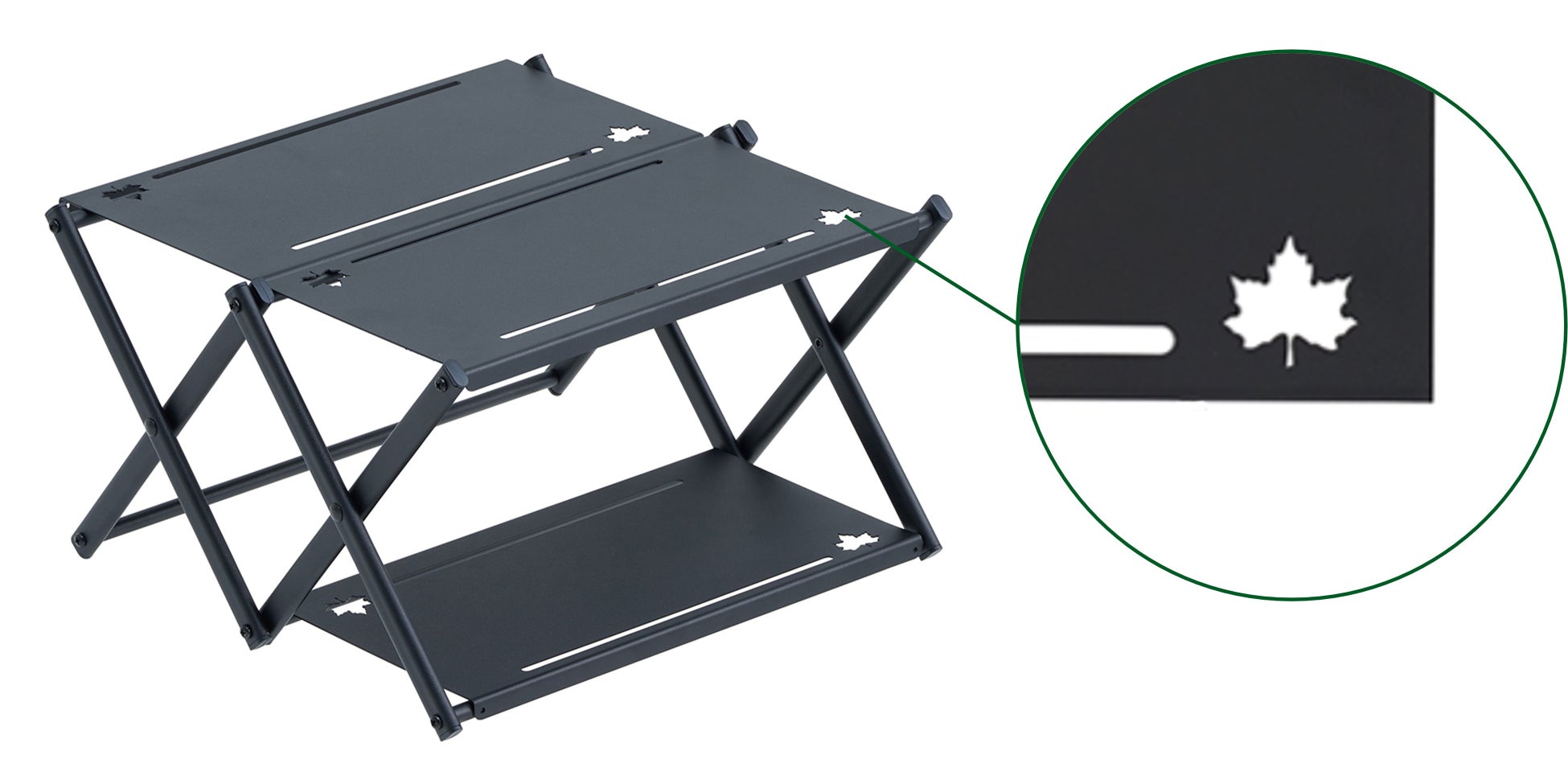 カラーはブラックで汚れが目立たず、幅広いシーンにマッチ。天板の端の部分には、メイプルリーフ型がそれぞれ2箇所くりぬかれており、機能性だけでなくデザイン性にも配慮。