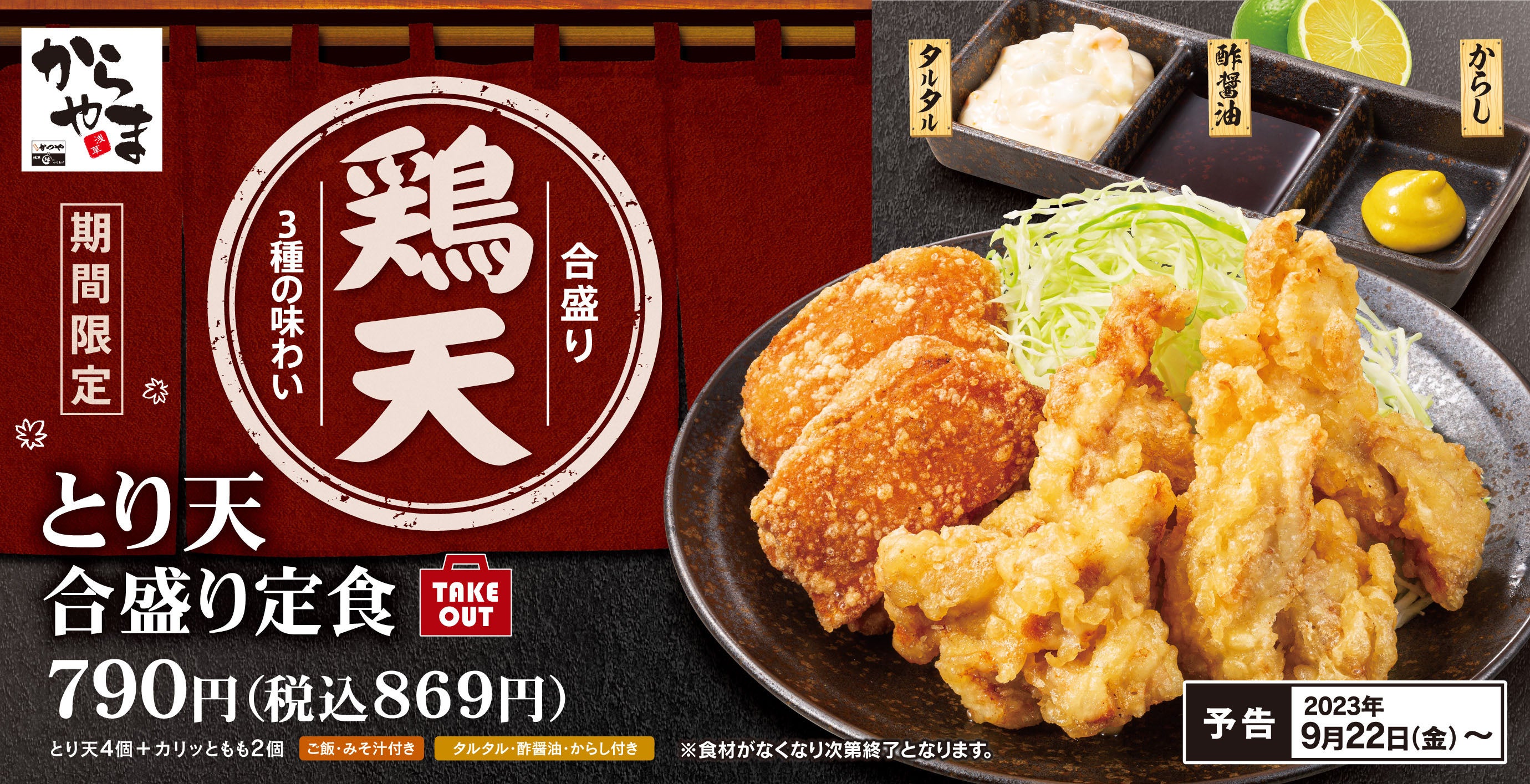 ジューシーで旨味をギュッととじこめ、家庭では再現できないと評判の人気NO.1「カリッともも」を軽い衣で鶏の旨味がダイレクトに口いっぱいに広がる「とり天」と合盛りにした「とり天合盛り定食」を、からあげ専門店「からやま」にて2023年9月22日(金)より期間限定で販売を開始いたします。