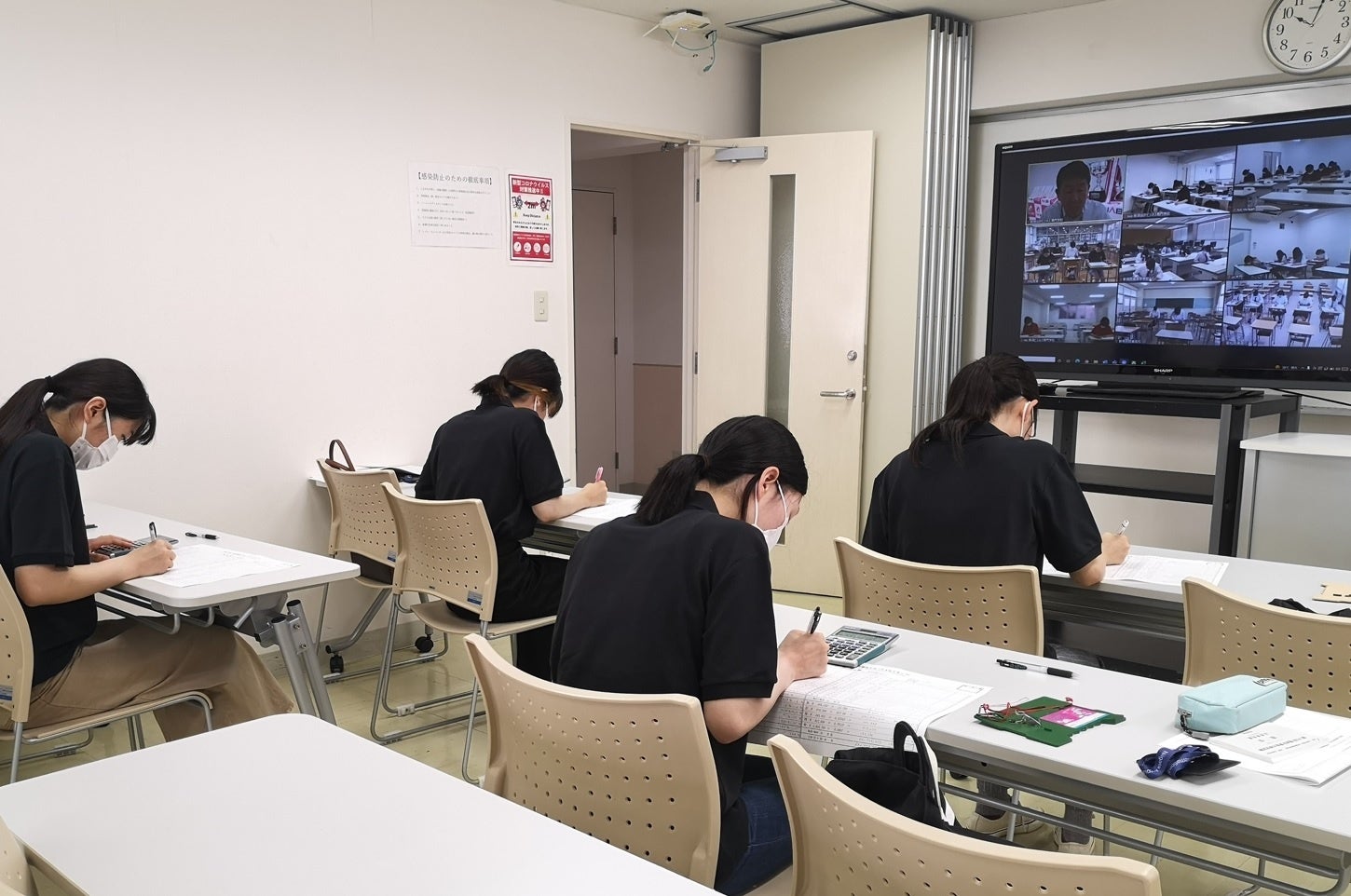 オンライン形式での開催は、人の移動や大人数で集まることに伴う感染のリスクを回避できるため、今回有力な代替手段として活用することにいたしました。親善大会当日は、運営委員が参加校の教室が映し出されたモニターに常時向き合い、競技中も監督を行います。採点は厳正公正に実施するため、答案を本校にメール添付で送っていただき、本校で採点を行いました。