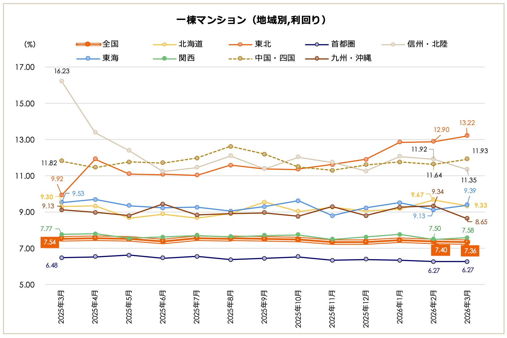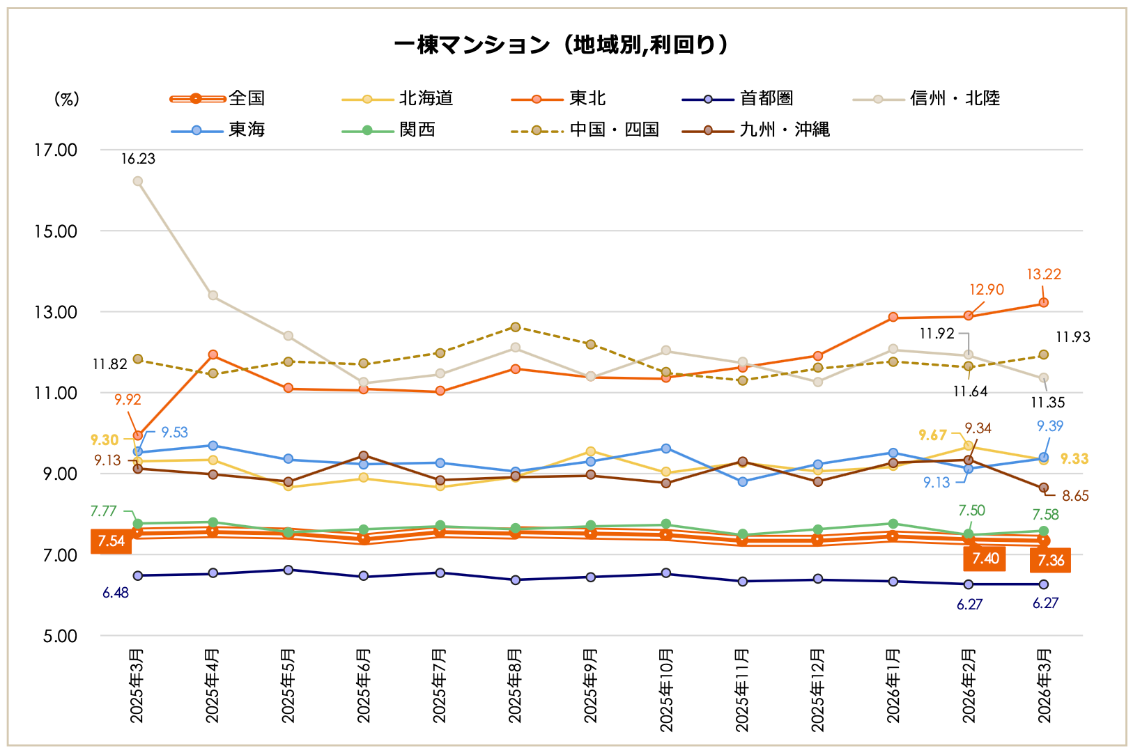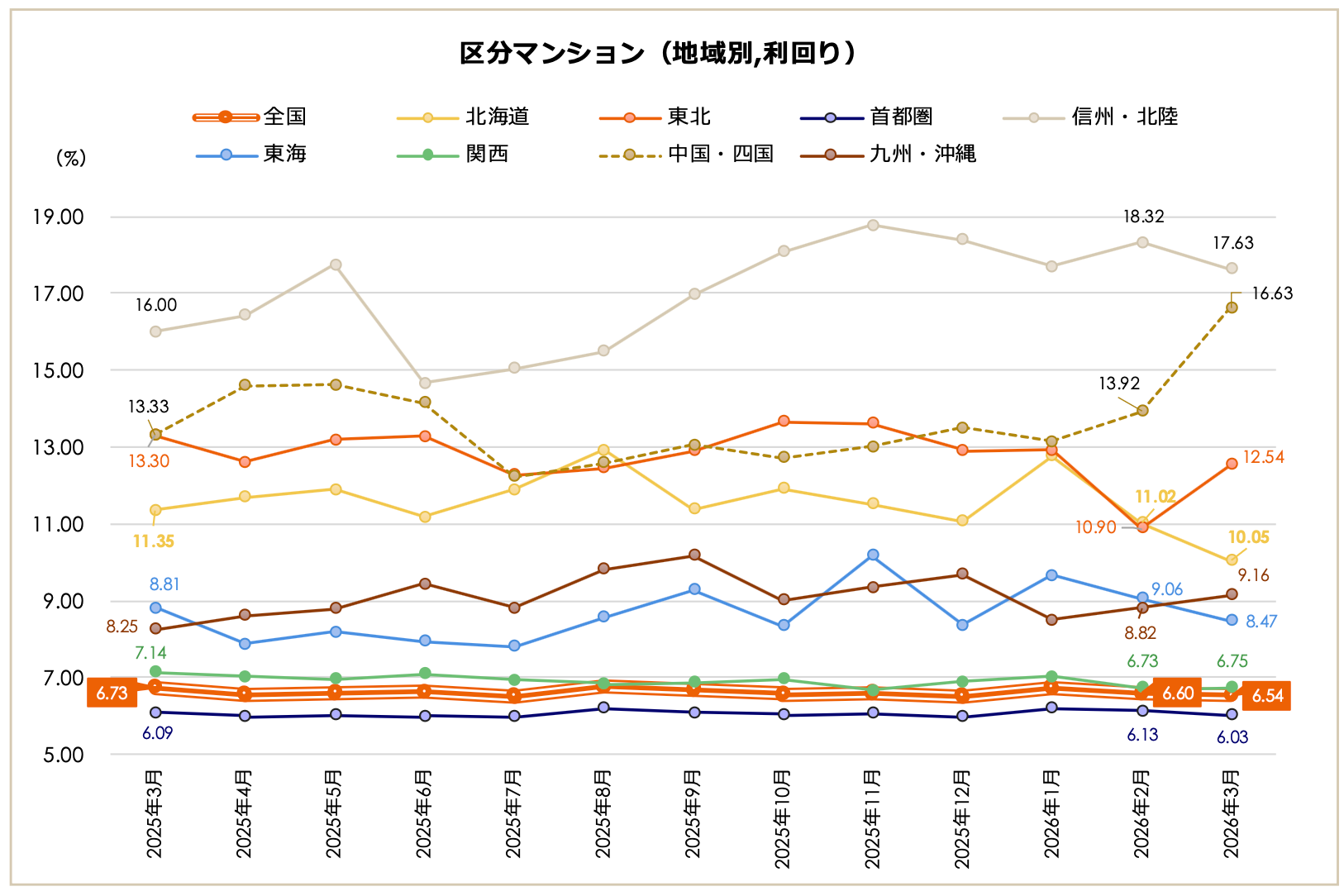 北海道(4,535万円)と関西(8,728万円)が直近1年間の最高値を更新し、前月比ではすべての地域で価格が上昇。前年同月比でも、多くの地域で価格は上昇した。利回りは前月比、前年同月比ともに、地域ごとにばらつきが見られたが、全体的には小幅な動きに留まった。