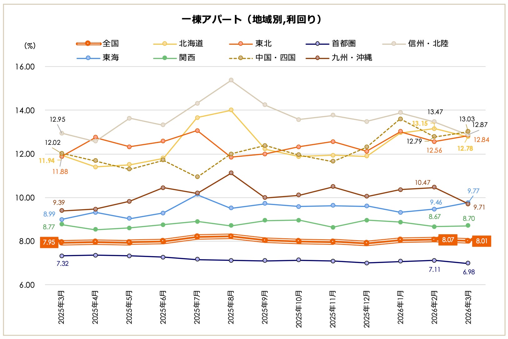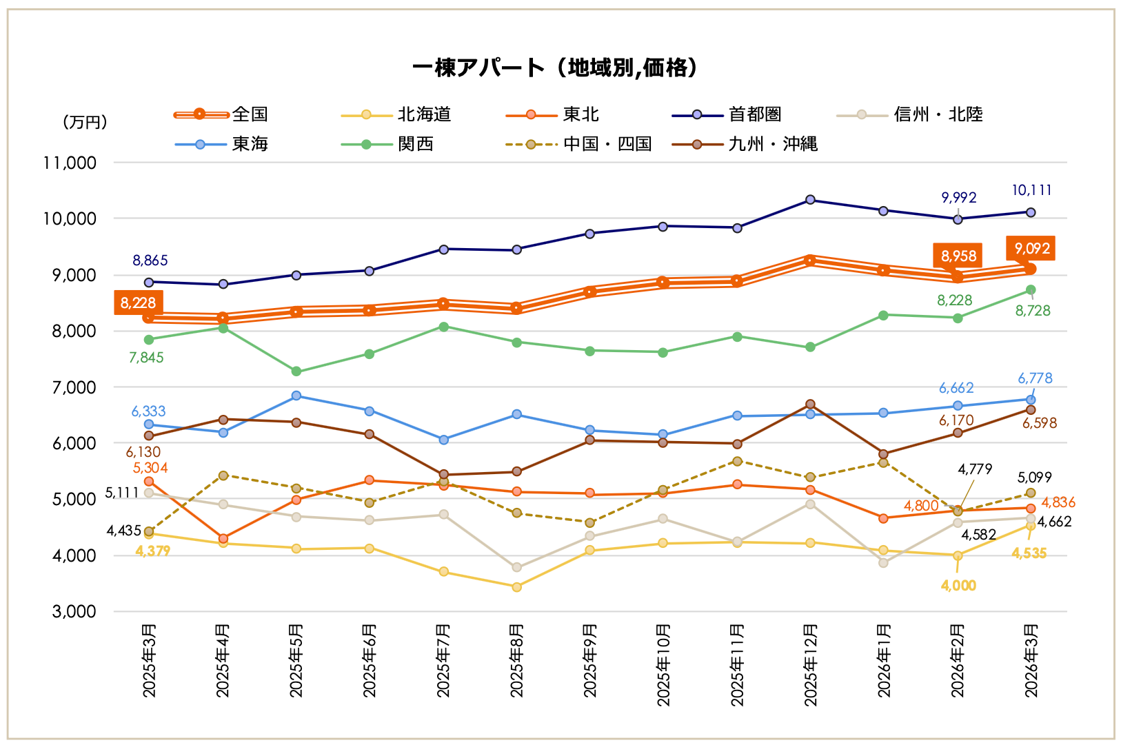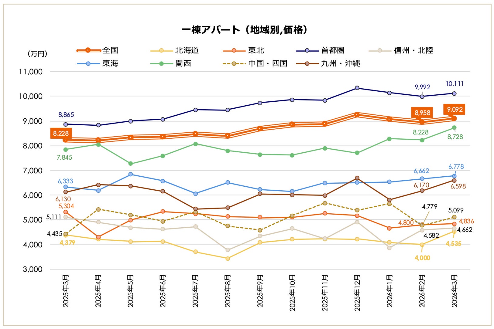 2026年3月期の一棟アパート市場は、全国平均価格が9,092万円で、2008年4月の集計開始以降、2番目に高い数字となりました。前月比では+1.50%、前年同月比では+10.50%となっています。全国平均利回りは8.01%で、前月比では-0.06ポイント、前年同月比では+0.06ポイントでした。