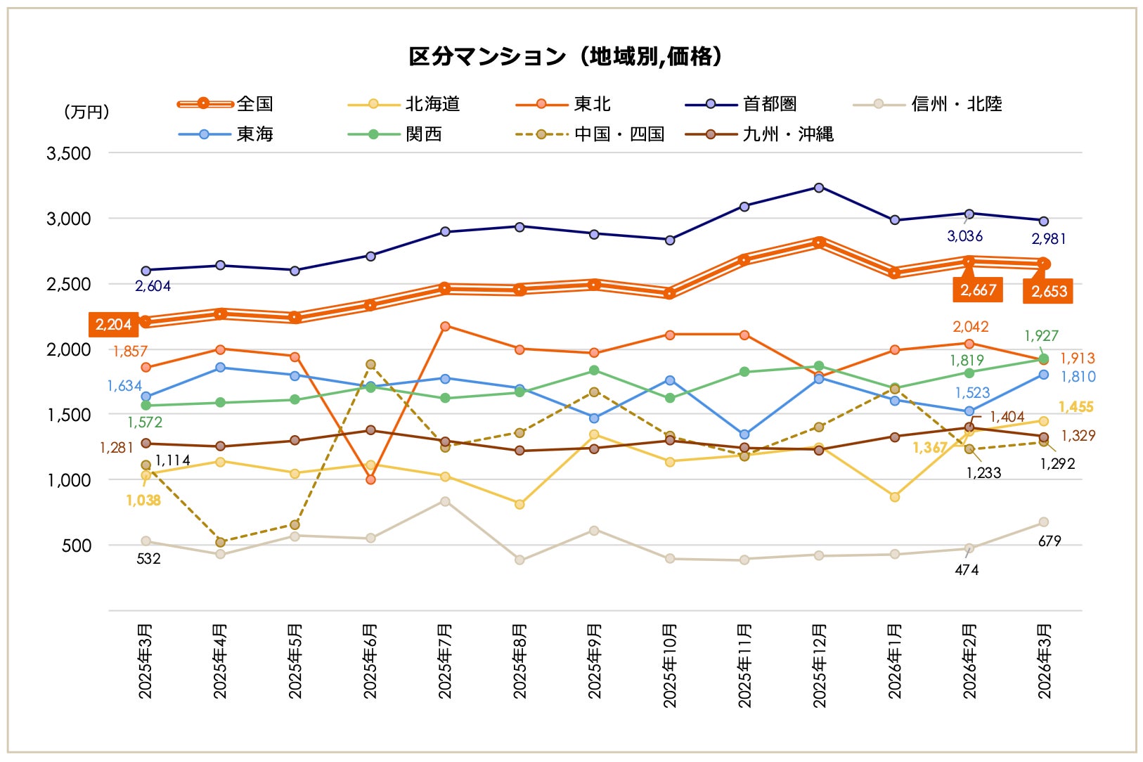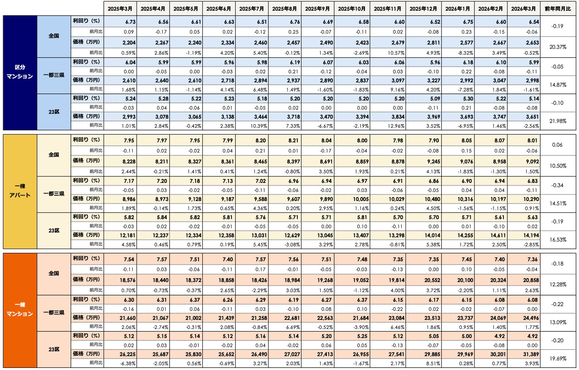 2026年3月期の区分マンション市場は、全国平均価格が2,653万円で、前月比では-0.52%、前年同月比では+20.37%となりました。前月比ではマイナスとなりましたが、全体としては値上がり傾向が続いています。全国平均利回りは6.54%で、前月比では-0.06ポイント、前年同月比では-0.19ポイントとなりました。