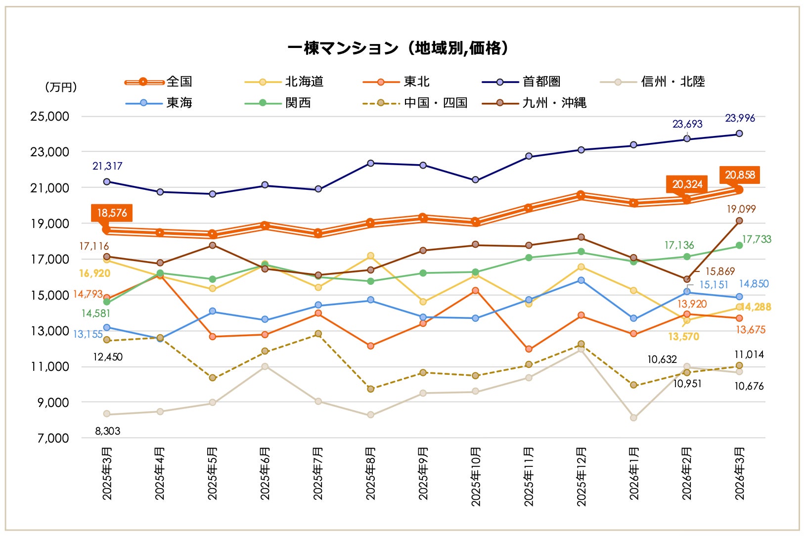 地域別に価格の推移を見てみると、首都圏(23,996万円)、関西(17,733万円)、九州・沖縄(19,099万円)が、直近1年の最高値に。ただ、前月比でみると、九州・沖縄が+20.35%と前月のマイナス分を補ってさらに上昇したほかは、小幅な増減に留まりました。一方で、前年同月比では、ほとんどの地域で10%を超える大きな動きに。首都圏(+12.57%)、信州・北陸(+28.58%)、東海(+12.88%)、関西(+21.62%)、九州・沖縄(+11.59%)で上昇、北海道(-15.56%)、東北(-7.56%)、中国・四国(-11.53%)ではマイナスとなりました。