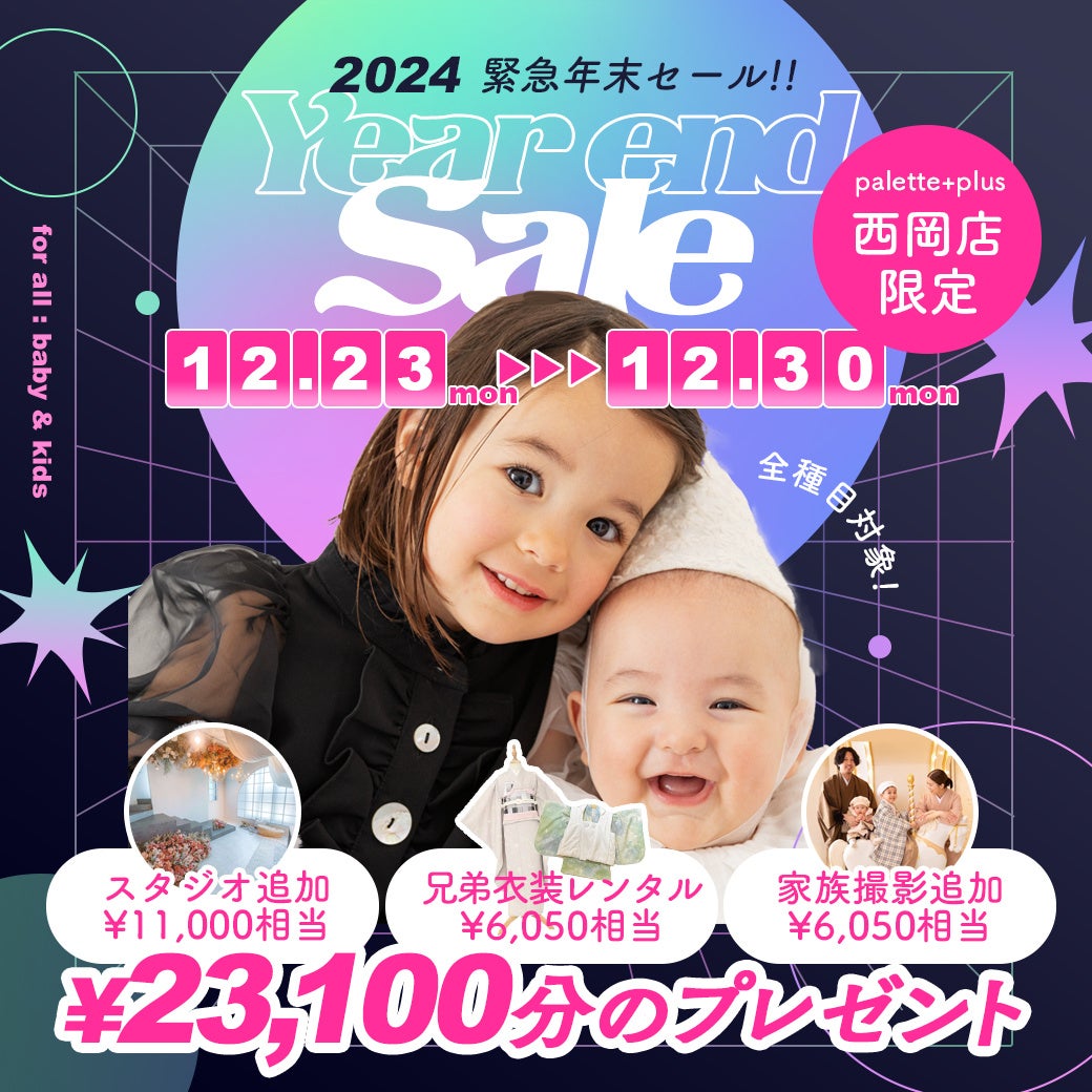 北海道札幌市豊平区にあるPalette+plus札幌西岡店(本社/有限会社三景スタジオ)で年末セールの開催が決定。2024年の9月にオープン1周年を迎える記念すべき年、たくさんのお客様に支えられて、たくさんのお客様のご記念に寄り添わせていただきました。