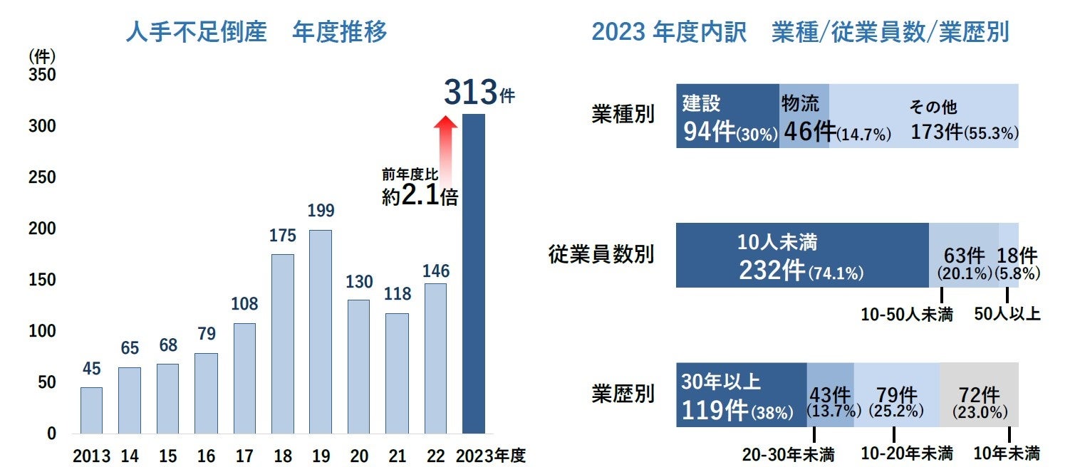 2023年度の人手不足倒産は313件となり、前年度の146件から倍増。統計として遡れる2013年度以降でこれまで最も多かった。新型コロナ感染拡大前である2019年度の199件を大きく上回り、過去最多を大幅に更新した。
