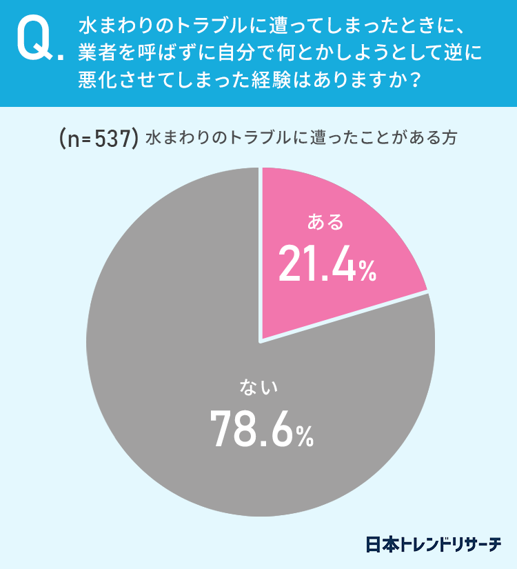 21.4%の方が、水まわりのトラブルが起きた際に、業者を呼ばずに悪化させてしまった経験が「ある」と答えています。