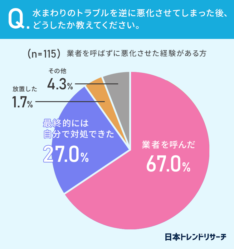 67%の方が、水まわりのトラブルを逆に悪化させてしまった後に「業者を呼んだ」と回答しています。