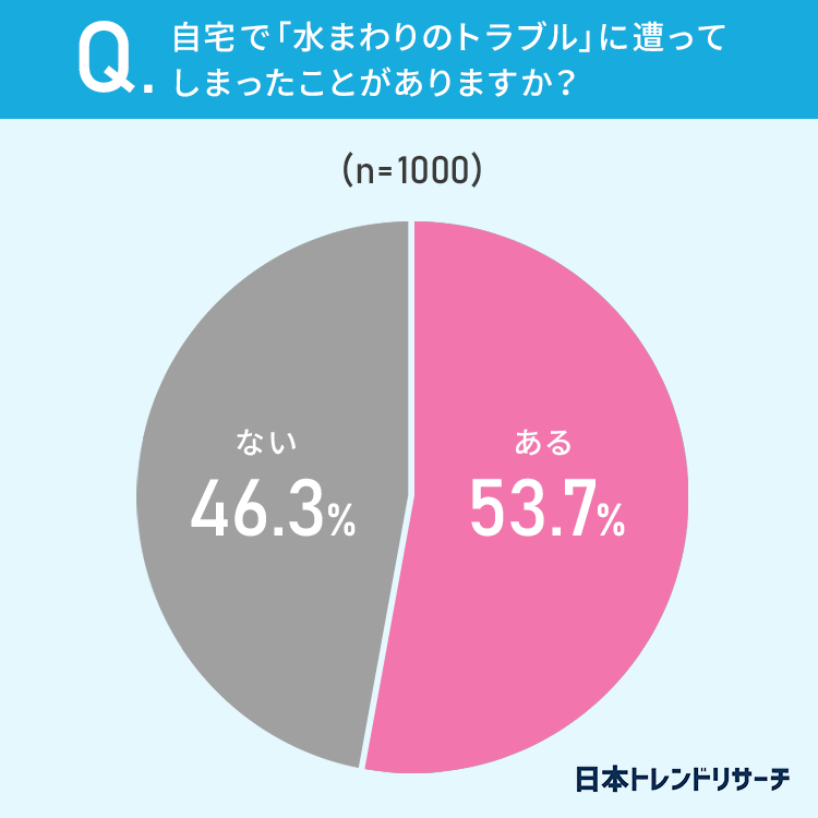 53.7%の方が自宅で「水まわりのトラブル」に遭ってしまったことが「ある」と回答しました。