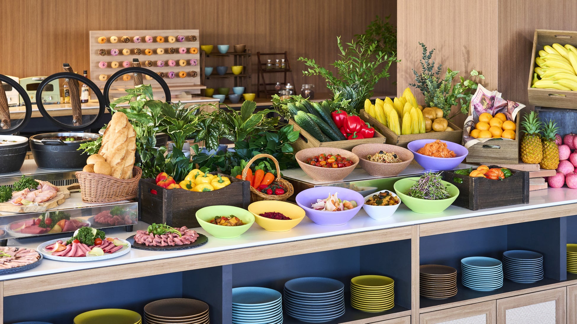 開業2周年を迎え、ビュッフェレストラン「Le Sensoriel(ル・サンソリエル)」では、2026年4月1日よりFood & Beverageの新コンセプト「マルシェ」をイメージした新しいシグネチャーメニューの提供を開始しました。「旬の食材を丁寧に選び抜く場所」を意味する言葉「マルシェ」では、思わず足を止めたくなる「発見の楽しさ」、目の前で料理が仕上がるライブキッチンの「ワクワク感」、そして旅先ならではの「新鮮な体験」がつまっています。メニュー開発では、マルシェ文化の原点であるヨーロッパの郷土料理に加え、近年高まる食の多様性への関心を背景に、さまざまな食習慣やライフスタイルに寄り添うことを大切にし、ベジタリアンメニューを充実させました。また、小さなお子さまとご一緒のゲストにも安心してお越しいただけるように「キッズコーナー」では、お子さまが召し上がりやすいメニューを展開しています。新メニューとして「コーンスープのポップコーン添え」や「照り焼きサーモン(朝食のみ)」も登場します。