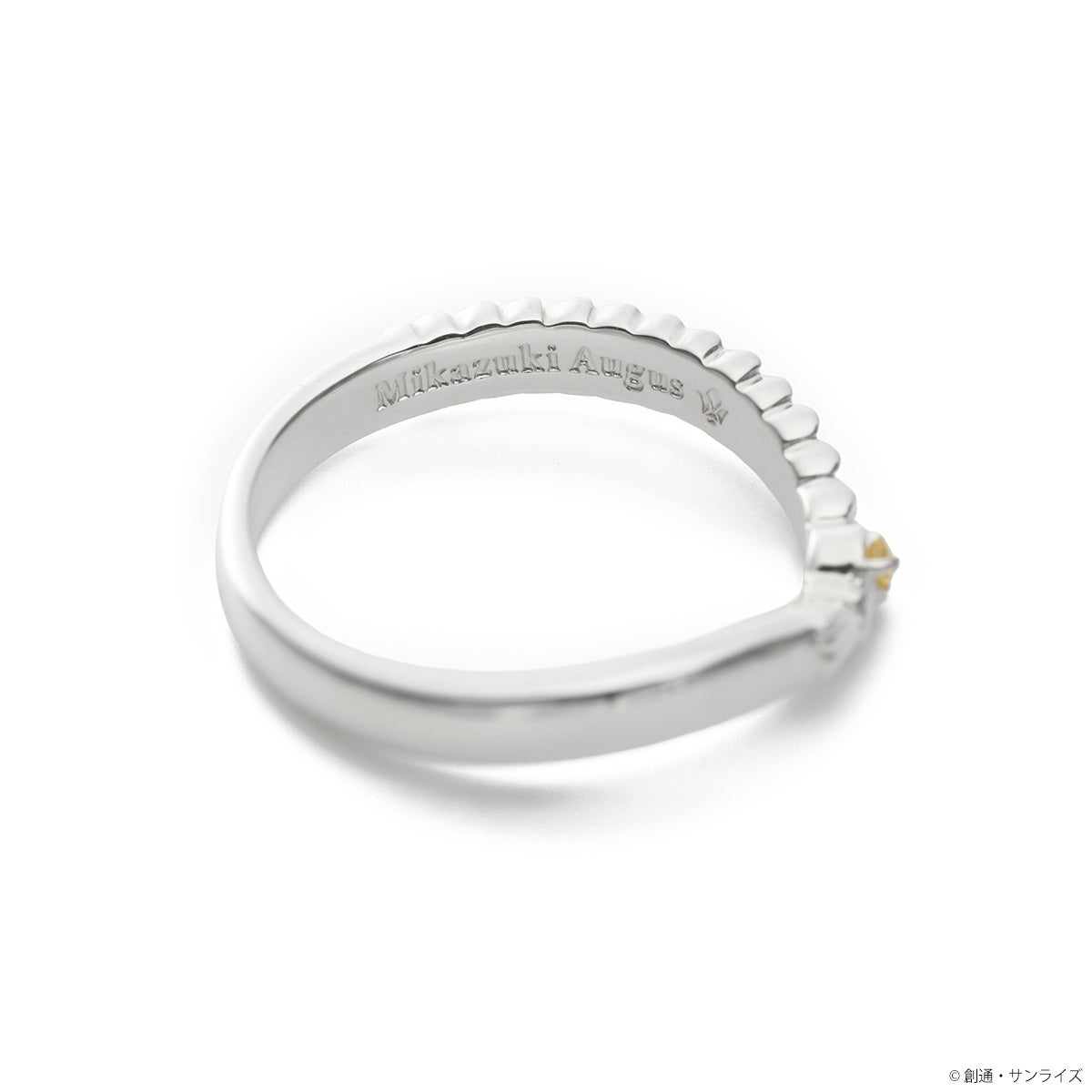三日月・オーガスモデルは、ブレスレットをモチーフに取り込んだV字デザイン。中央の三日月マークには、イメージカラーのストーンをセットし、内側には名前と鉄華団のマークの刻印を施しました。