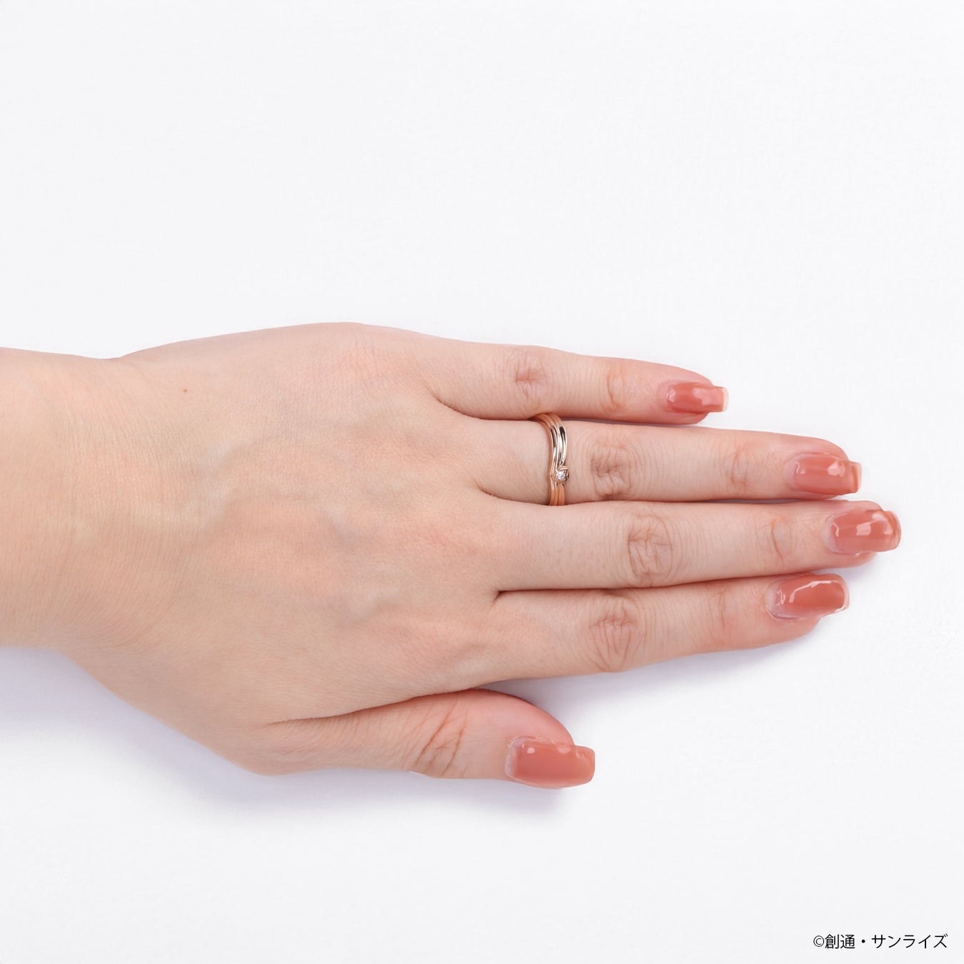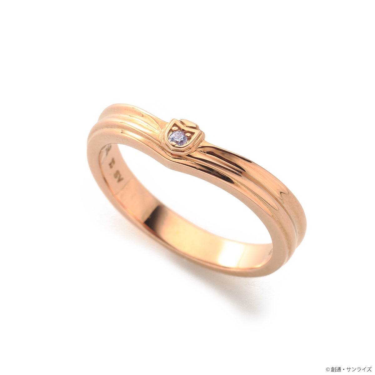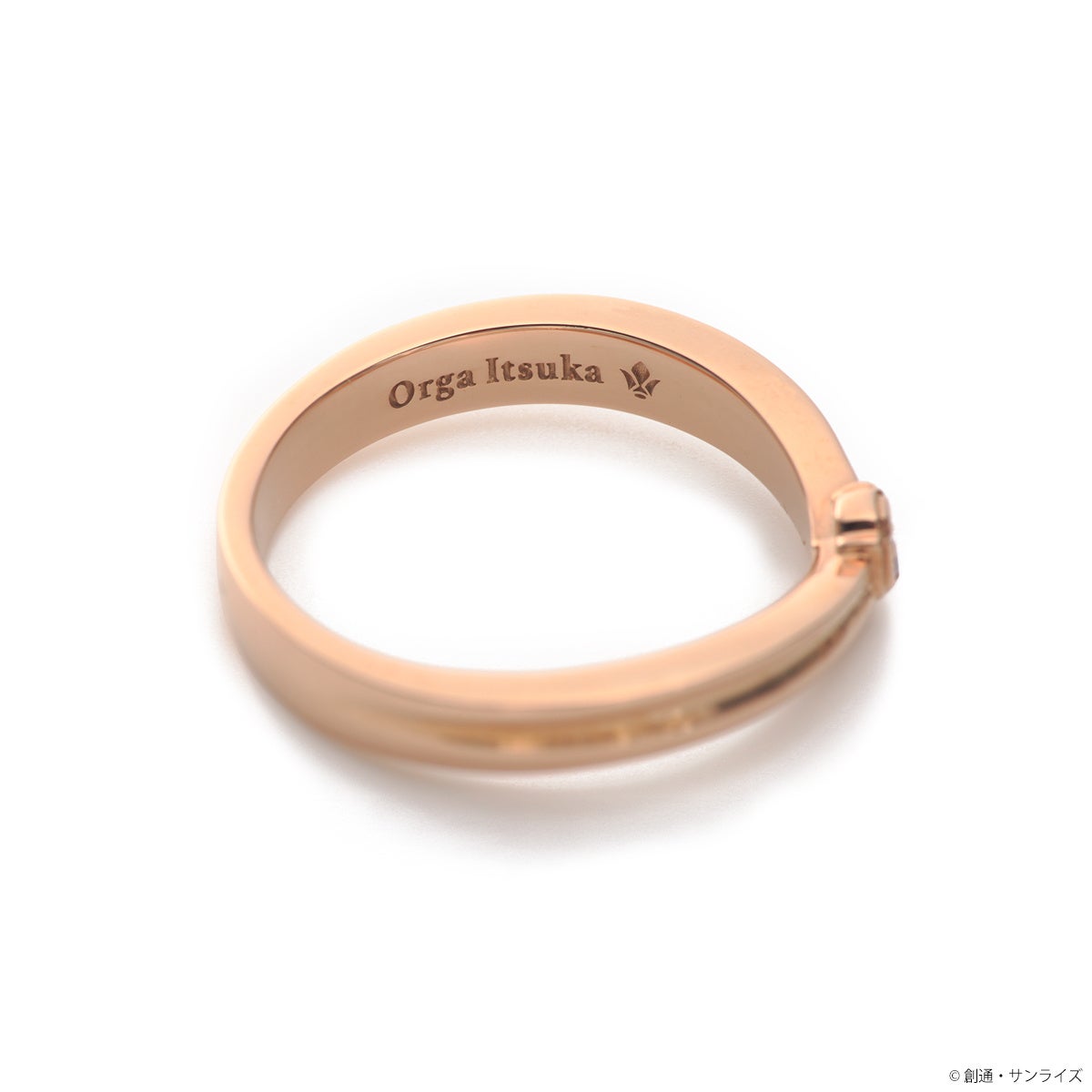 オルガ・イツカモデルは、ピンクゴールドコーティングを施した、首元のスカーフを思わせるV字型のデザインに、旗艦イサリビをモチーフとして中央にあしらいました。イメージカラーストーンをセットし、内側には名前と鉄華団のマークの刻印を施しました。