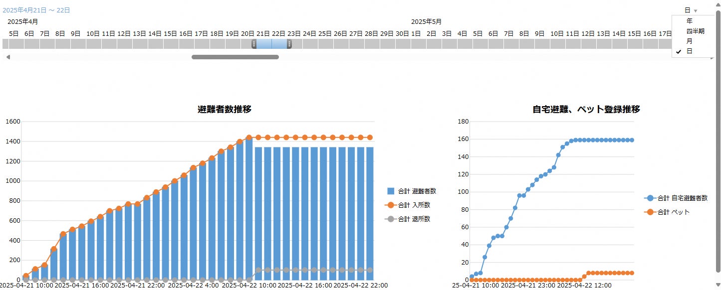 さらに、入力された受付データは即時に共有され、避難所ごとの滞在者数などをリアルタイムで把握できるようになります。これにより、市災害対策本部の迅速な判断や支援につなげます。