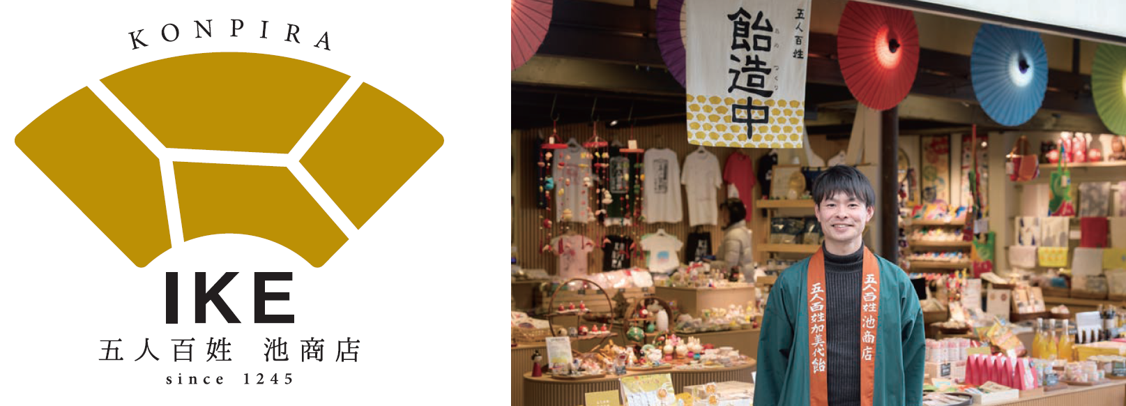 1245年(寛元3年)、香川県琴平町の金刀比羅宮の境内(参道)にて創業した「五人百姓池商店」(以下 同社)は、「こんぴらさん」の名で親しまれるこの地で、780年以上にわたり伝統のご利益飴「加美代飴(かみよあめ)」の製造・販売を続けています。五人百姓とは、1,000年超の歴史をもつといわれる金刀比羅宮が琴平町に来る際、お供してきた5つの家系のことであり、神事の手伝いを続けながら、今も参拝者向けに飴を作り続けている5軒の飴屋を指します。その家系のひとつが同社です。