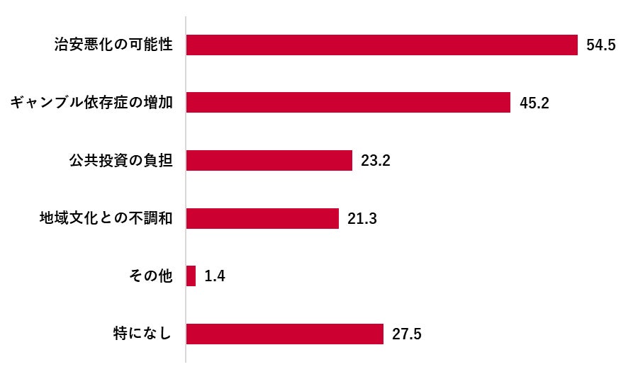 懸念点については「治安悪化の可能性」(54.5%)、「ギャンブル依存症の増加」(45.2%)が上位となり、安全や社会的影響への不安がうかがえる。