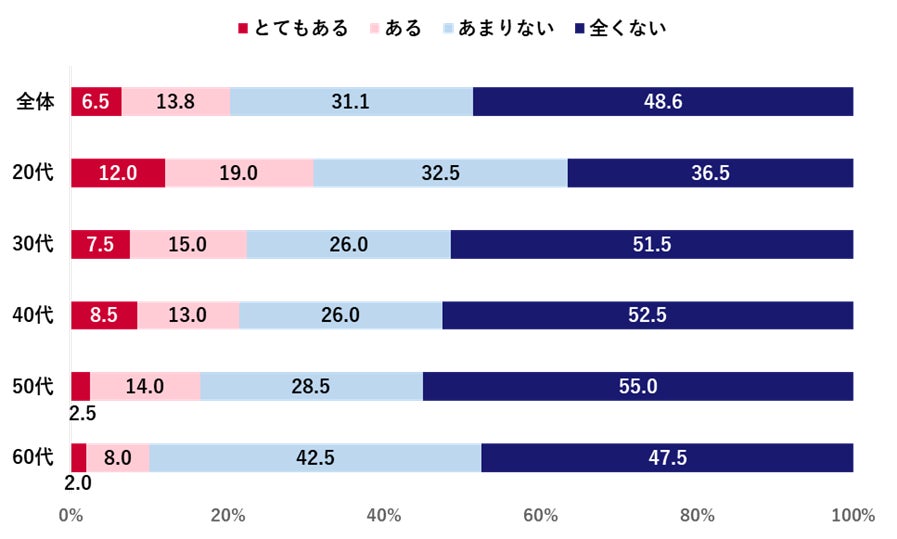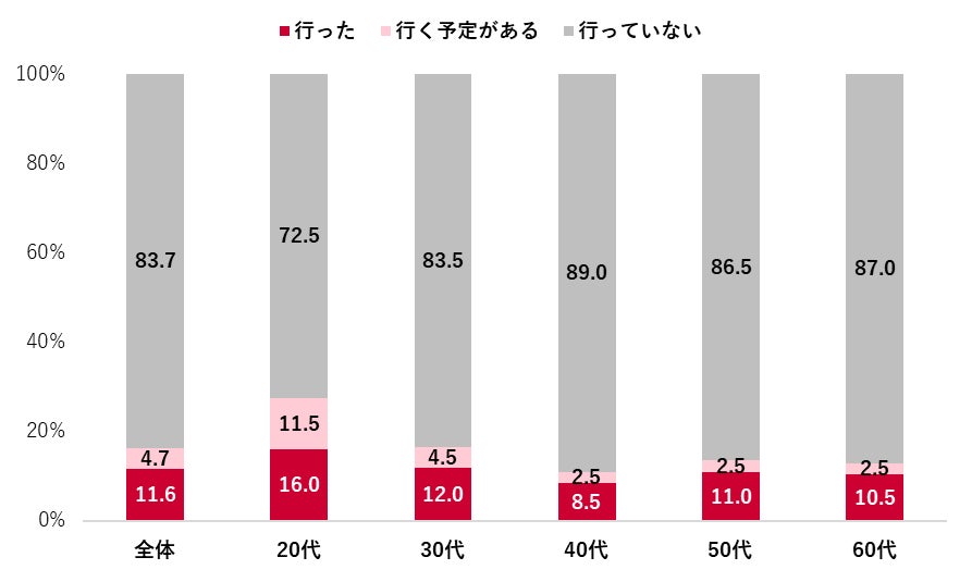 年代別で見ると、20代では「行った」が16.0%、「行く予定がある」が11.5%と、他の年代よりも高かった。