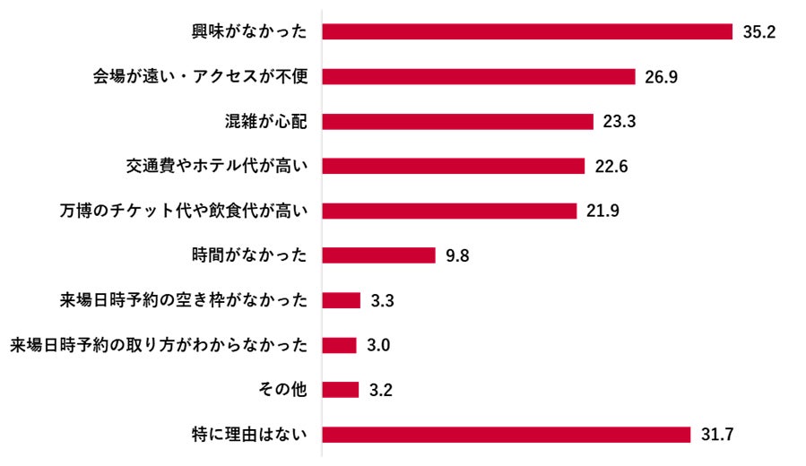 大阪・関西万博に「行っていない」(83.7%)と回答した方を対象に、行かなかった理由を伺ったところ、「興味がなかった」(35.2%)がトップ、次いで「会場が遠い・アクセスが不便」(26.9%)だった。「特に理由はない」との回答が31.7%だった。