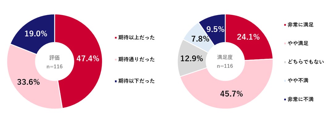 来場者の評価は総じて高く、「期待以上」47.4%、「期待通り」33.6%だった。合わせると約8割が肯定的に評価していた。満足度は「非常に満足」24.1%、「やや満足」45.7%で合わせると70%近かった。