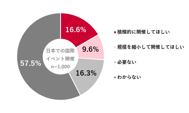 今後、日本で万博や五輪などの国際イベントを開催することについて、「積極的に開催してほしい」と回答した人は16.6%にとどまった。また、「わからない」が57.5%と多数を占めた。