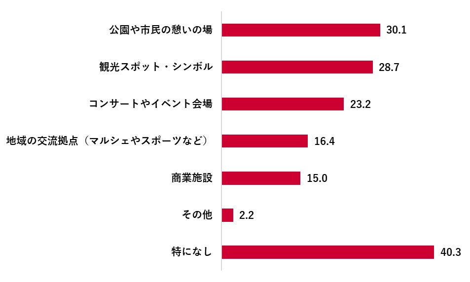 万博閉幕後の「大屋根リング」などの施設をどのように活用するとよいか聴取したところ、「公園や市民の憩いの場」(30.1%)、「観光スポット・シンボル」(28.7%)が上位だった。一方で、「特になし」が40.3%となった。