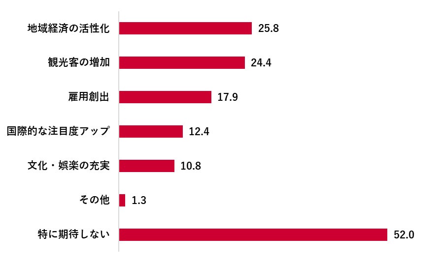 IRの開業による効果として「地域経済の活性化」(25.8%)や「観光客の増加」(24.4%)を期待する一方で、「特に期待しない」が52.0%だった。