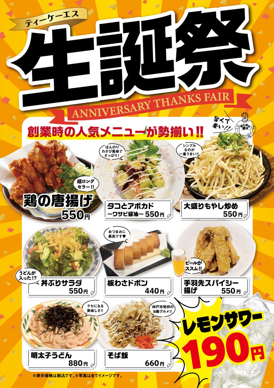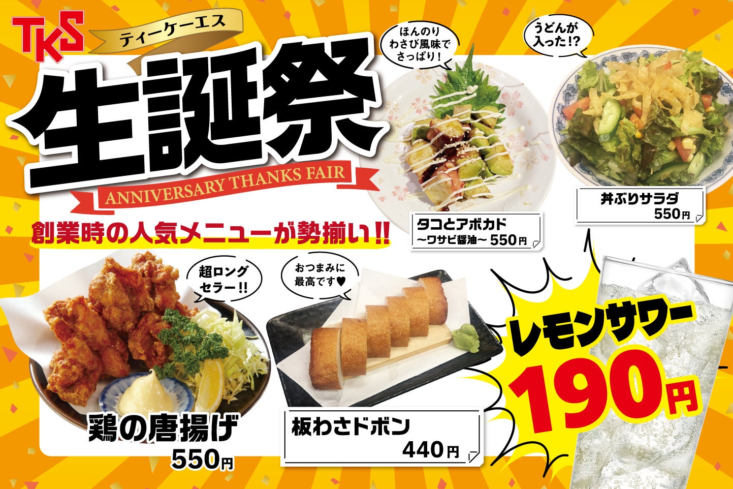 今年33回目となる『生誕祭』は、創業当時の人気メニューを一堂に集め復活させ、さらにレモンサワーを1杯190円(税込)の特別価格にてご提供いたします!