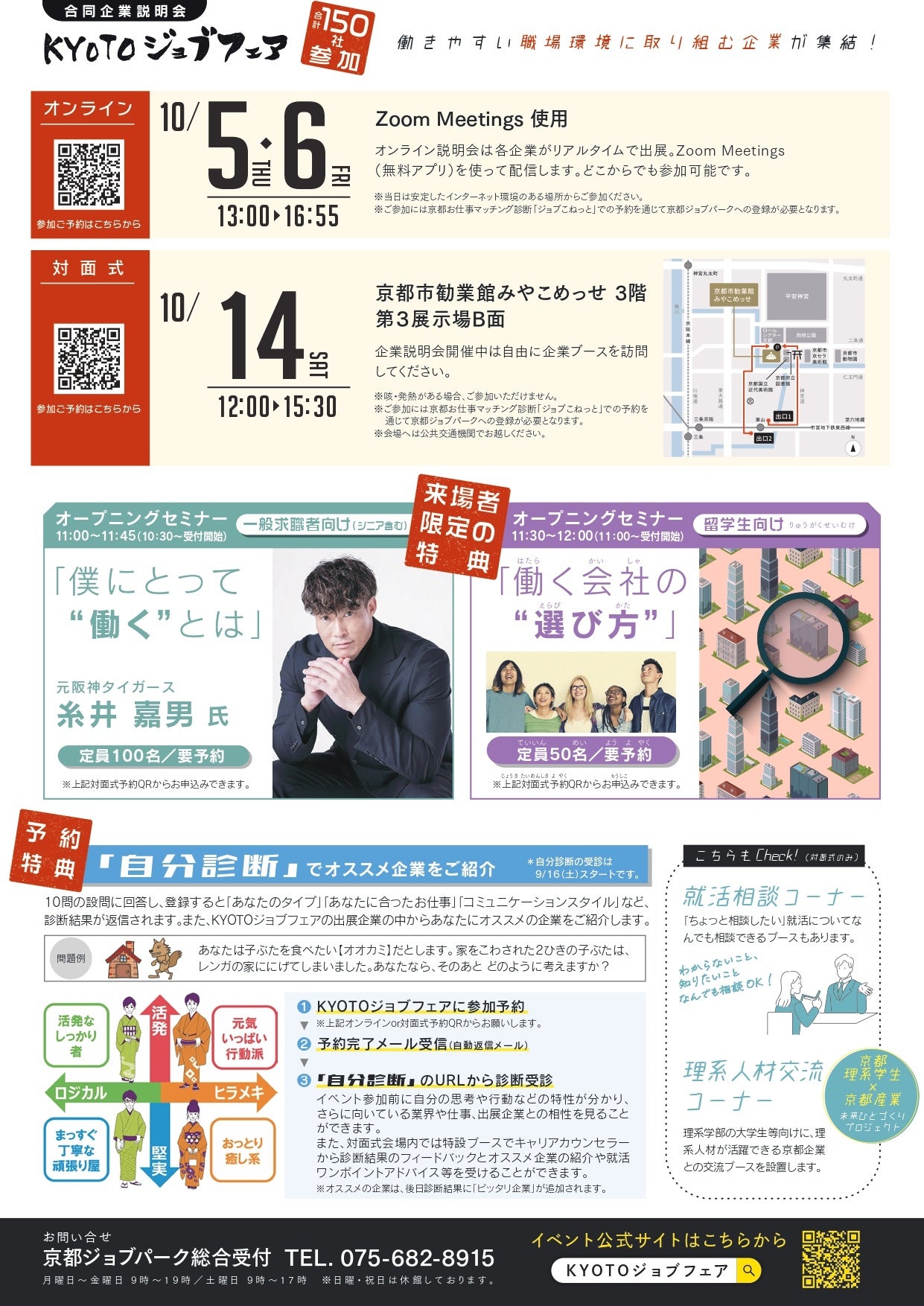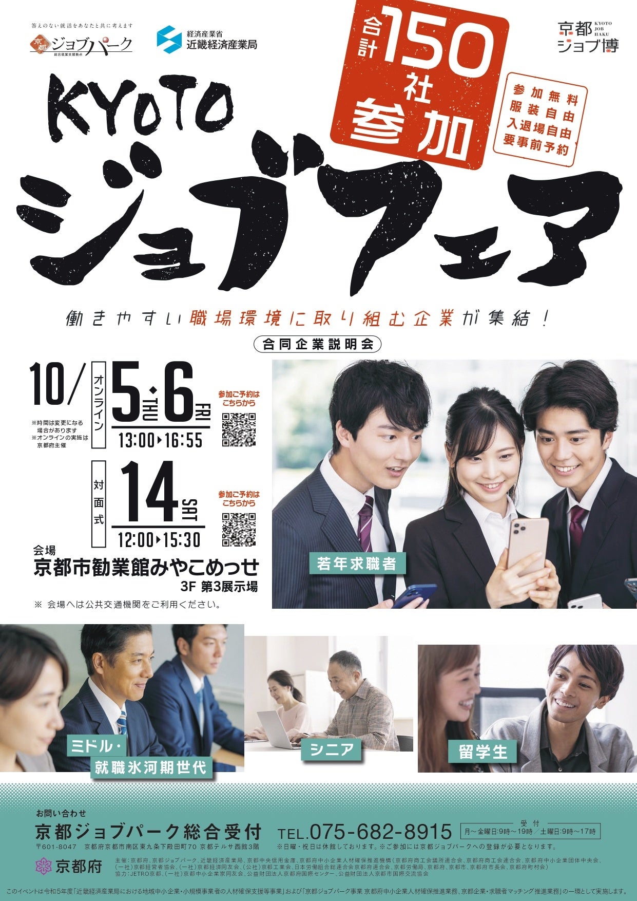 京都企業最多150社集結!「KYOTOジョブフェア」 を10月5、6日にオンラインで、14日に京都市勧業館みやこめっせで対面開催します。