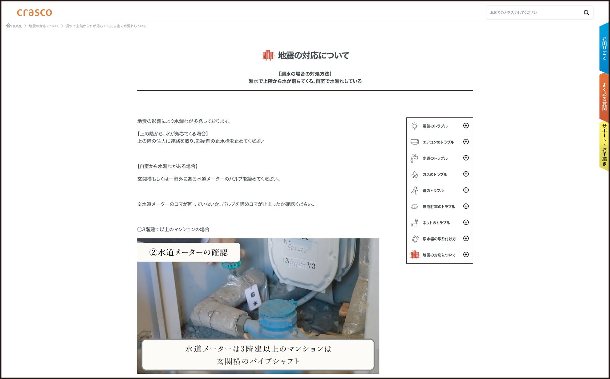 クラスコでは、地震発生直後の16時40分から対策本部を立ち上げ、地震の影響で生じたトラブルへの対応を開始しました。地震発生から3日で入居者からの問い合わせは300件を超え、緊急度の高い問題から順番に対応いたしましたが、想定外の数の問い合わせにより、即時対応が困難な問題が増えておりました。このため、比較的簡易な不具合に対しては、入居者が自分で対応し解決できるように、自社開発したノーコードで入居者マニュアル作成ツールにて地震問題解決マニュアルを掲載した特設サイトを設置しました。こちらは、クラスコへの電話が繋がりにくい状況が続いている中、入居者に問題を解決してもらう上で効果を発揮しました。さらに、地震の影響による住まいのお困りごとをクラスコの管理物件にお住まい以外の方も解決してもらえるようサイトを無料公開し、約1ヶ月で28,721件のサイトアクセスがありました。
