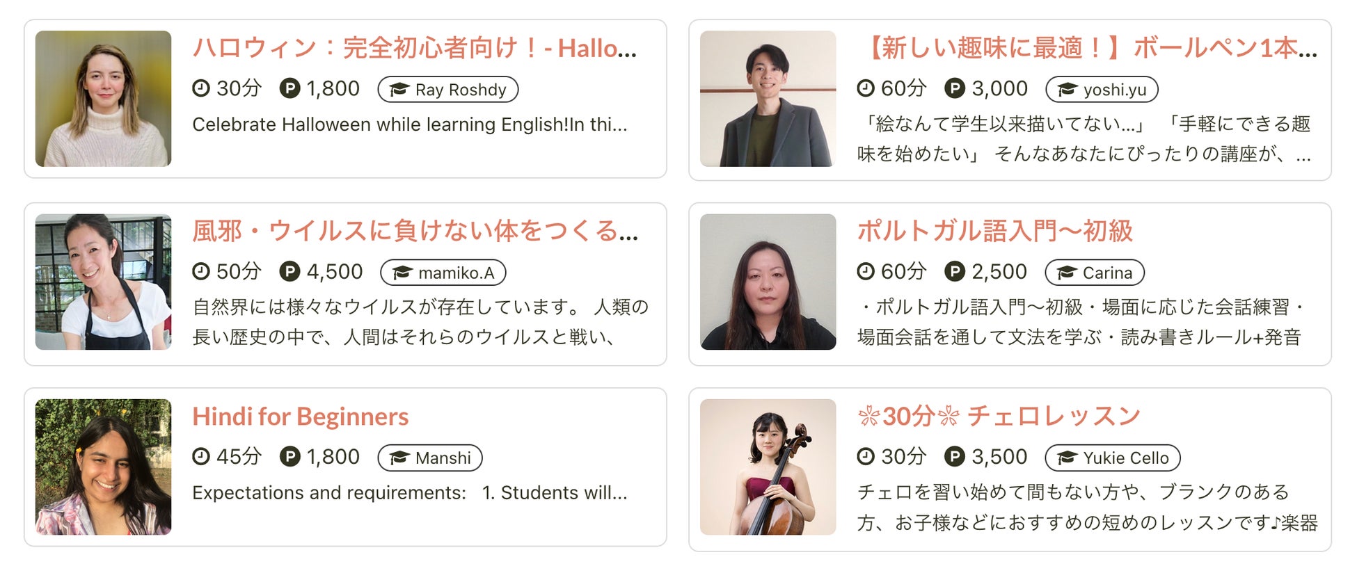 ま世界で活躍する音楽・アート・ヨガ講師から直接レッスンを受講できたり、送迎不要でキッズ向けに人気の将棋や習字などの習い事を見つけたりと、地域を問わず様々なバックグラウンドを持つ世界の講師陣と出会えるのがカフェトークです。