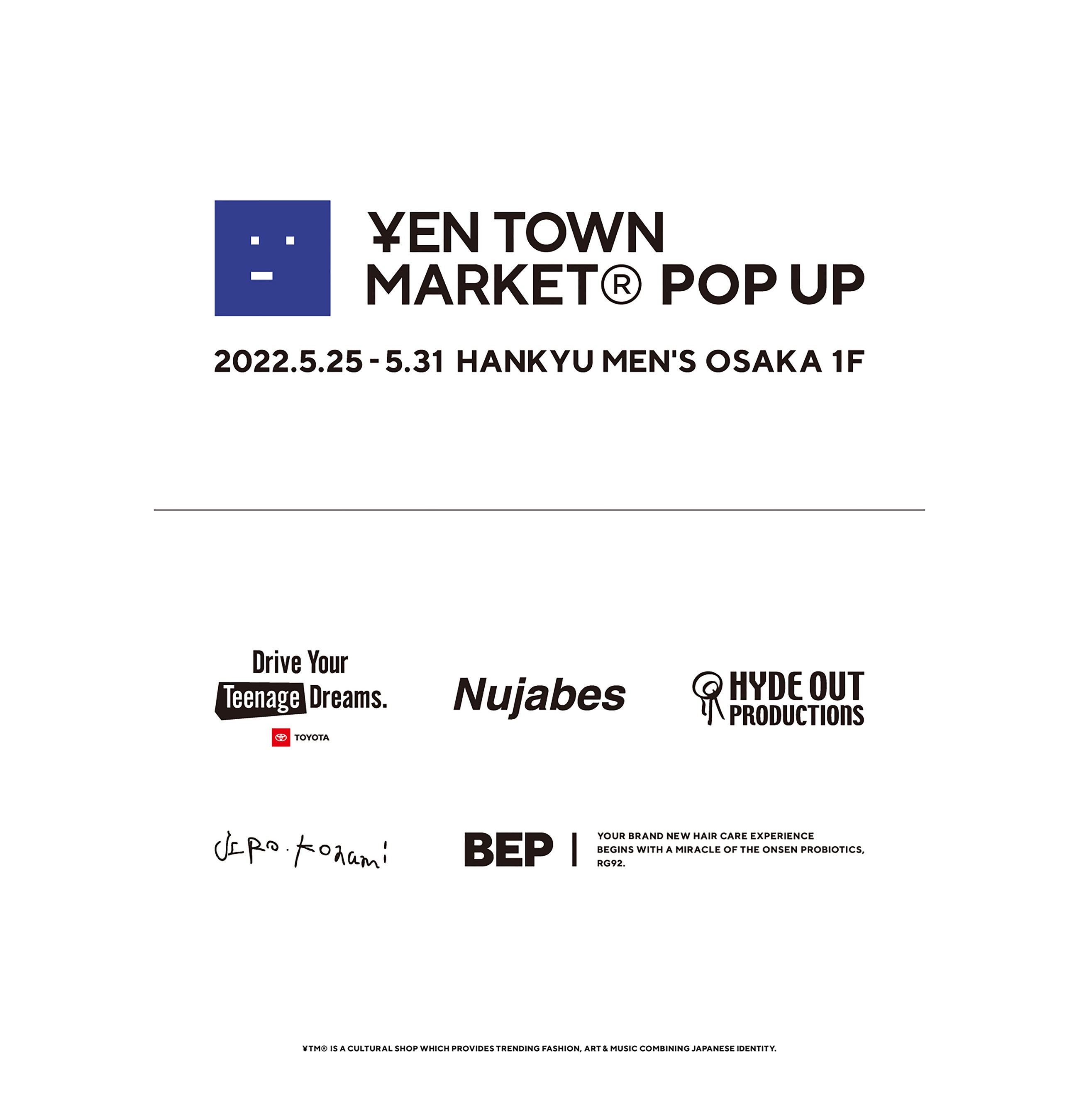 「YEN TOWN MARKET」は日本らしさをアイデンティティに、ファッション、アート、カルチャーにおける様々な企画や商品開発を行い、トレンドを発信するショップを目指している。ブランド名の“YEN”は日本通貨の“円(yen/¥)”を表している。今回のPOPUPでも渋谷PARCOで人気を博した「YEN」ロゴを大胆に使ったフーディーなどのオリジナルアパレルに加え、マネークリップなどの新しい雑貨も追加されている。