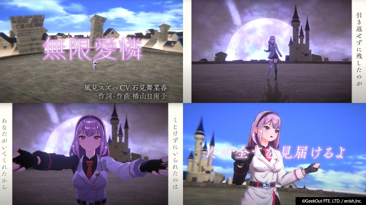 石見舞菜香さんが歌う「風見スズハ」のキャラクターソング『無限愛憐』は、風見スズハの希望、彼女の寛容性と愛を表現した楽曲になります。本楽曲は「風見コトハ」の楽曲と対になっており、あふれ出る優しさや希望を是非感じてください。