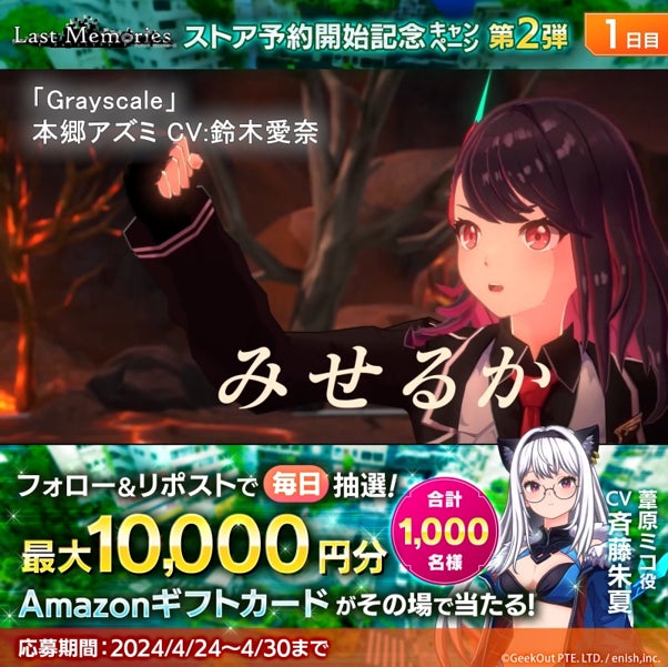 『ラスメモ』のストア事前予約開始を記念し、最大で10000円分のAmazonギフトカードが、毎日その場で、1000名様に当たるキャンペーンを開催中です。5月1日(水)11:59まで参加可能となっておりますので、奮ってご応募ください!