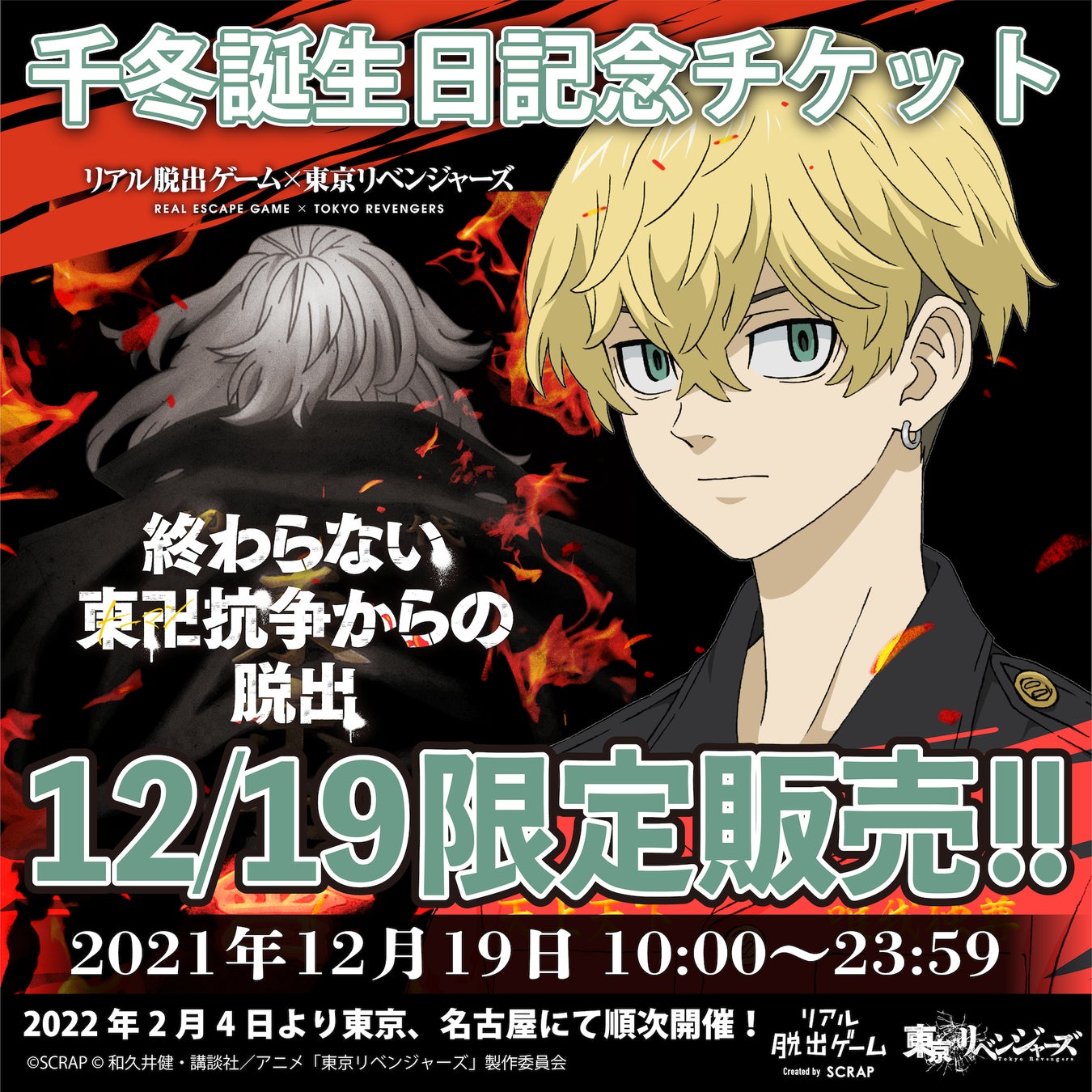 株式会社SCRAP(本社:東京都渋谷区 代表:加藤隆生)は、東京リベンジャーズ初となる謎解きイベント『終わらない東卍(トーマン)抗争からの脱出』を、2022年2月4日(金)よりリアル脱出ゲーム下北沢店にて、2月24日(木)よりリアル脱出ゲーム名古屋店にて開催することを発表いたします。