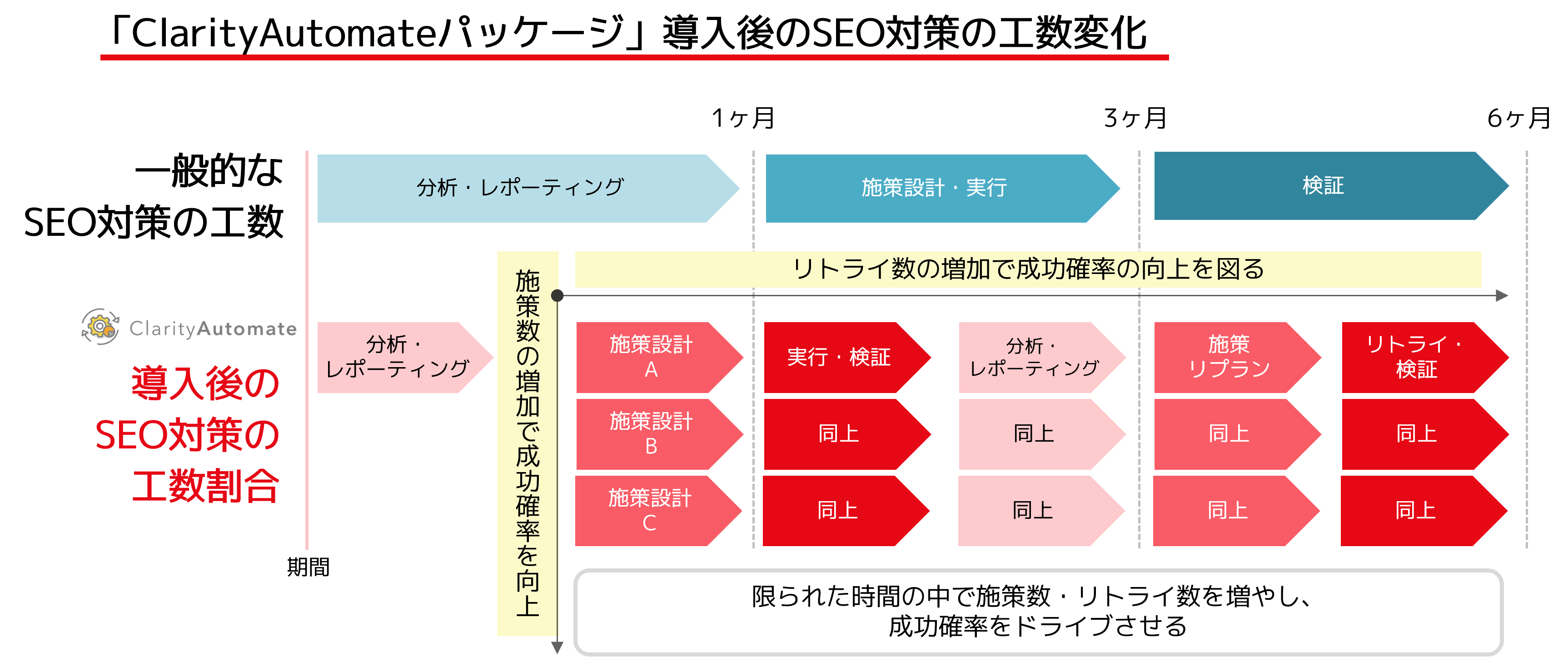 「ClarityAutomateパッケージ」の提供により、エンジニアによるサポートの工数を削減し、SEO施策の設計・実行・改善を加速させることが可能となります。