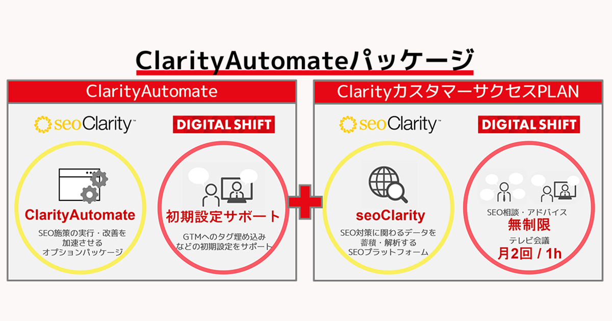 日本全国の企業のデジタルシフトの実現を支援する株式会社デジタルシフト(本社:東京都千代田区、代表取締役社長:吉田 康祐、以下、デジタルシフト社)は、SEO対策の課題を解決するseoClarity社(米国・イリノイ州 シカゴ、共同創設者ミト・ガンジー)が提供するエンタープライズSEOプラットフォーム「seoClarity」における、デジタルシフト社によるカスタマーサクセスのセットプラン「ClarityカスタマーサクセスPLAN」に、「ClarityAutomate」(クラリティ オートメート)を組み合わせた「ClarityAutomateパッケージ」の提供を開始することをお知らせいたします。
