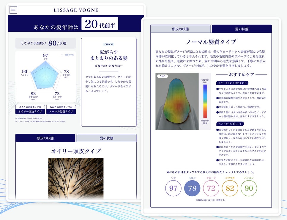 「リサージ」は、は40年以上にわたり肌をうるおすコラーゲン研究を続け、2000年よりヘアケアラインとして「LISSAGE VOGNE(リサージ ヴォーニュ)」を展開しています。2023年4月より、花王独自開発のAI解析技術を搭載し、24通りの組み合わせから最適なケアへ導くヘアカウンセリングツール「KAMI-TECH」の導入を主な取扱店で開始しました。「KAMI-TECH」では、べたつきや乾燥といった頭皮状態、硬さや柔らかさといった毛髪状態に関するアンケート情報と、毛髪をAIが画像解析した結果を組み合わせて「頭皮タイプ」「髪質タイプ」、そして「しなやか美髪度(※)」など髪の状態に着目したカウンセリングを提供。お客さま一人ひとりに合わせたおすすめのアイテムを提案してまいりました。