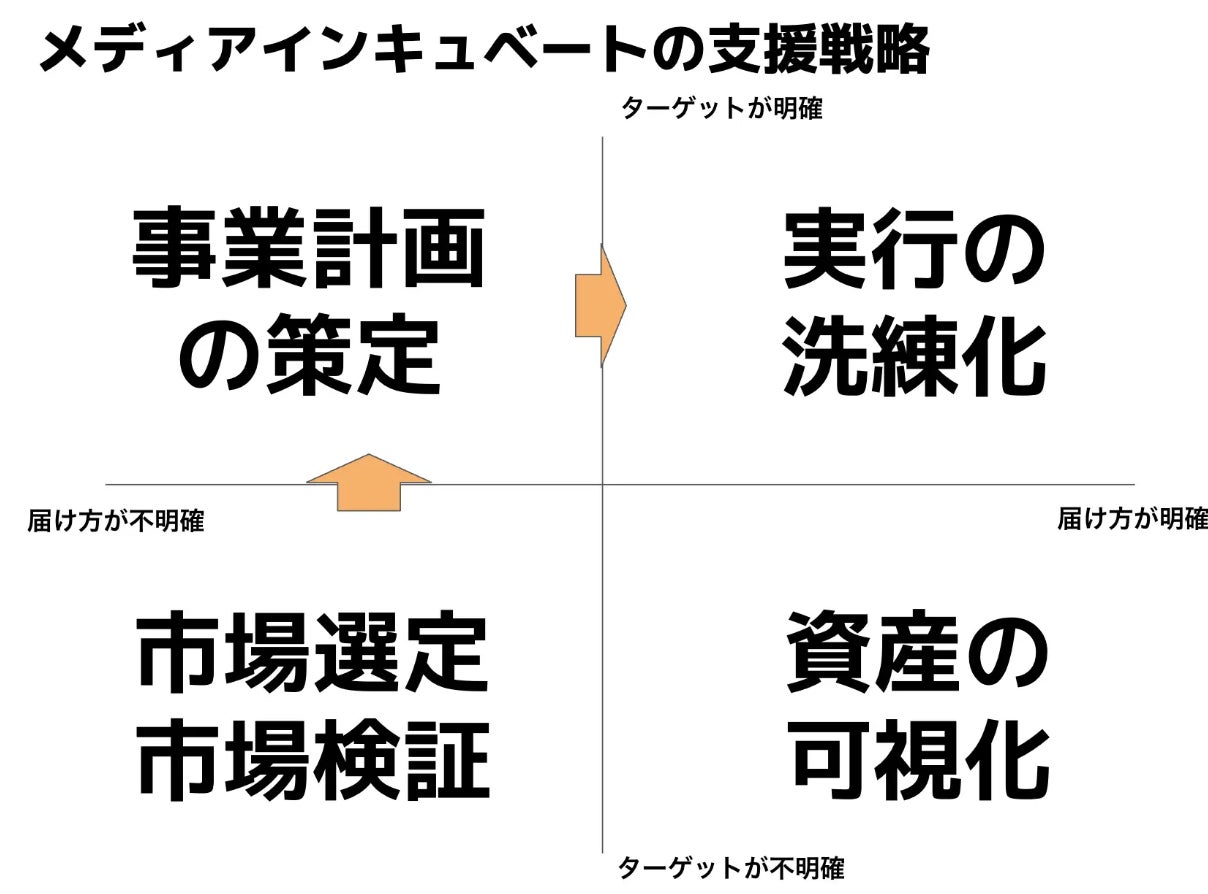 共創型課題抽出と初期検証: AIを活用した市場・競合・トレンド分析に加え、当社が運営する「未来プロジェクト」の数百名のプロフェッショナルネットワーク(アスリート、映画監督、各分野専門家など)とのコラボレーションを通じて、事業の「何を大切にしているか」「何を持っているのか」を徹底的に棚卸し。「現実的に必要な事業規模」を明確にし、AIで解決可能な潜在ニーズや未開拓市場を「見つけ」ます。(メディアインキュベート支援戦略図:「市場調査の支援」「届け方が不明確」領域のアクションに対応)