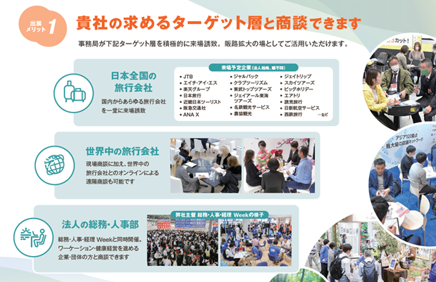 - 本展の特徴① 日本全国/世界中の旅行会社、法人の総務・人事部と商談できます