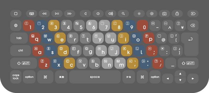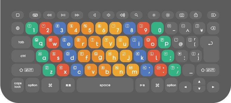 使用頻度の低い機能のみをあえて取り除き、プログラミングやタブレット学習に特化した機能を盛り込んだ製品です。独自の配列を採用しており、一般的なキーボードと同様にひらがな印字を施しています。