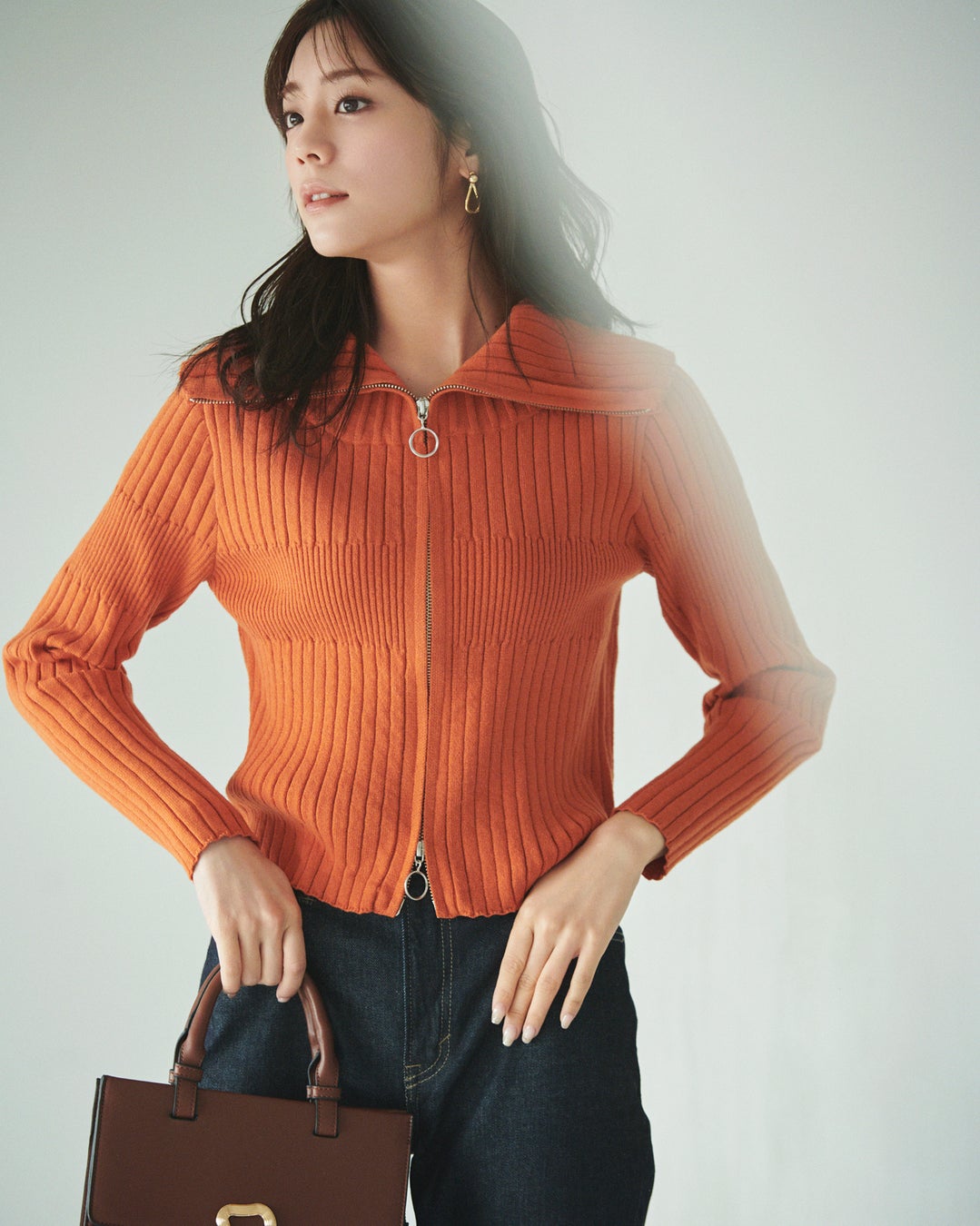 コンパクトなボディに、大きな襟とフープジップがアクセントになったリブニットのカーディガン。ジップは上下両方から開閉できるので、1枚着としても羽織ものとしても重宝します。ボリューム感のある襟は小顔効果もあり、開け方次第でさまざまな着方が楽しめます。リブの太さの変化も、貴島さんのこだわりです。