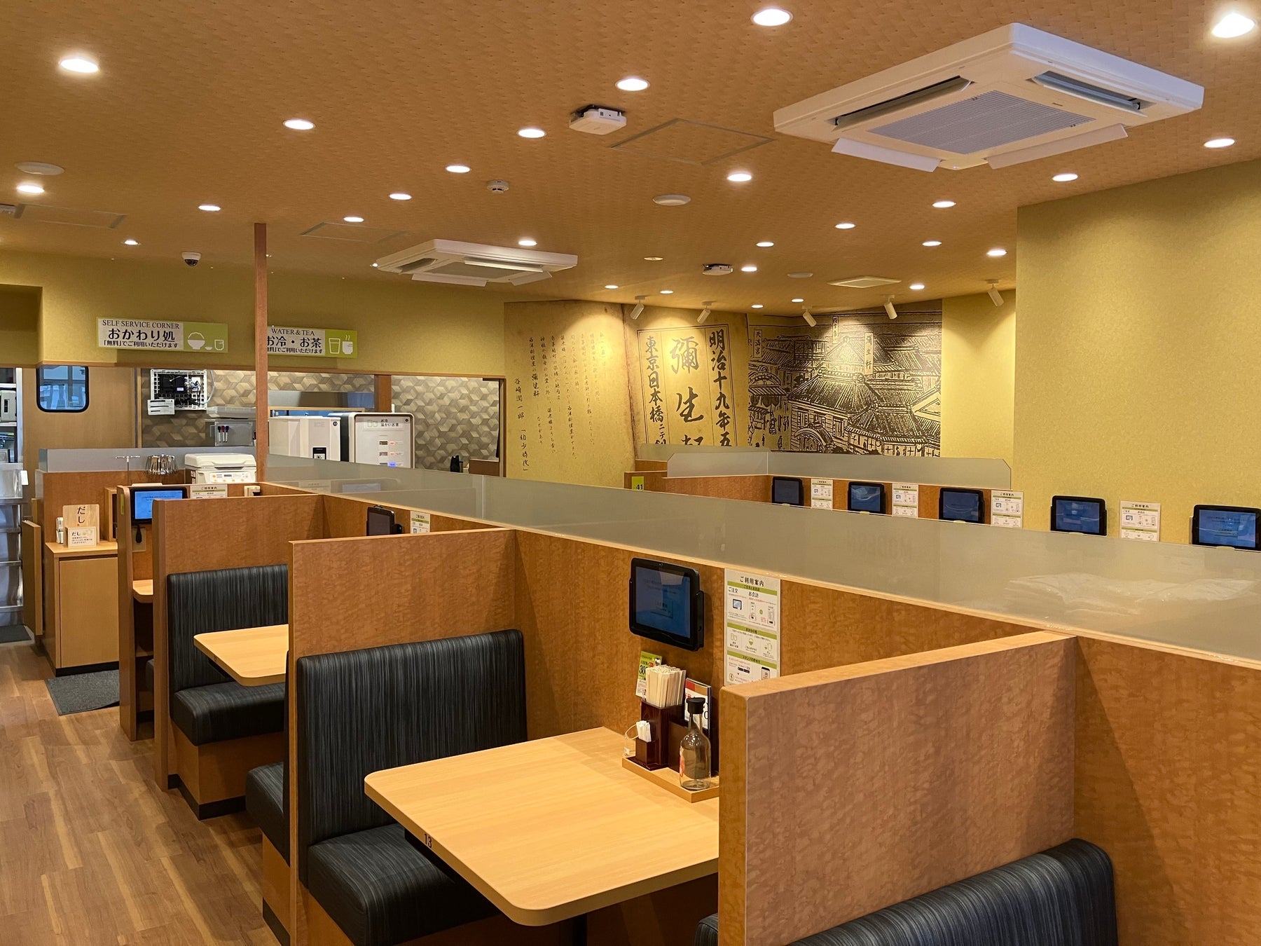 当店舗は2023年12月に公開しました新ロゴ・シンボルマークなど新しいブランドイメージを表現した店舗となっております。新ロゴ看板、モダンな“和”をイメージさせる暖簾(のれん)や「やよい軒」の名前のルーツでもある“彌生軒(やよい軒)”の歴史的資料をモチーフとした壁紙など、新ブランドステートメントを表現する“上質な”イメージでデザインされた店舗です。また、新しい取り組みとして、ゆっくりとメニューを選んでいただけるようテーブルに設置したタブレット端末からのオーダーをしていただけるようにしました。 もちろん、“ごはん”や“だし”、“漬け物”のおかわり自由が楽しめる『おかわり処』もございます。