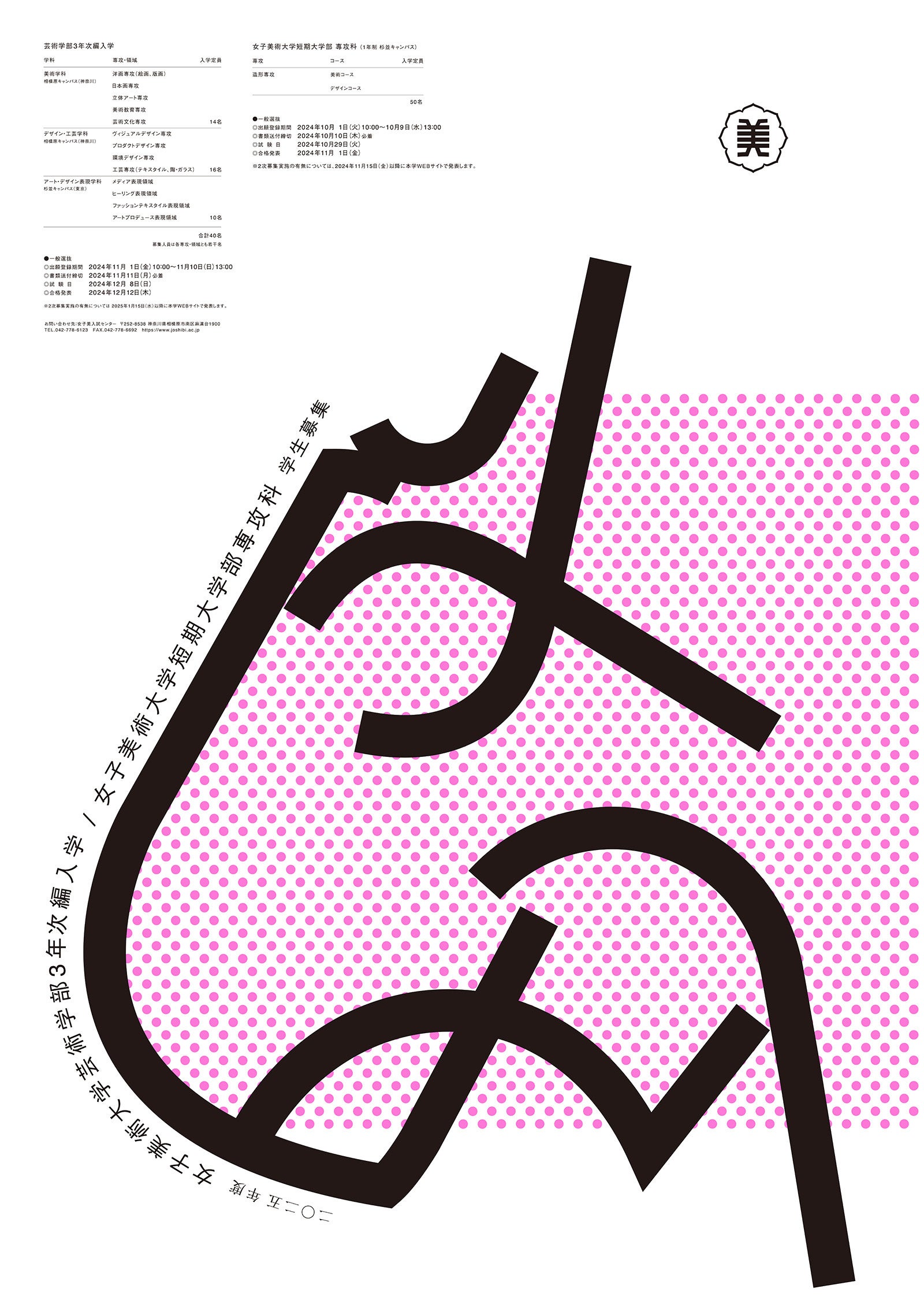 第27回の今年は、林規章氏による教育機関の学生募集ポスター「女子美術大学大学院/3年次編入/短大専攻科 学生募集」に決定しました。受賞作品は、同学の学生募集のために、20年前から毎年制作されてきたポスターシリーズの最新作です。JOSHIBIの「J」の形をモチーフにさまざまな表現が試みられてきました。「一貫して独自の幾何学的なスタイルを続けながら、その中で表現を研ぎ澄ませてきた」「女子美という軸を持ちながら、個性の輝きを失わずに、シンボリックな抽象性が発揮されている」「安定した造形力とキャラクター感に加え、毎年新鮮さがある」など、高く評価されました。