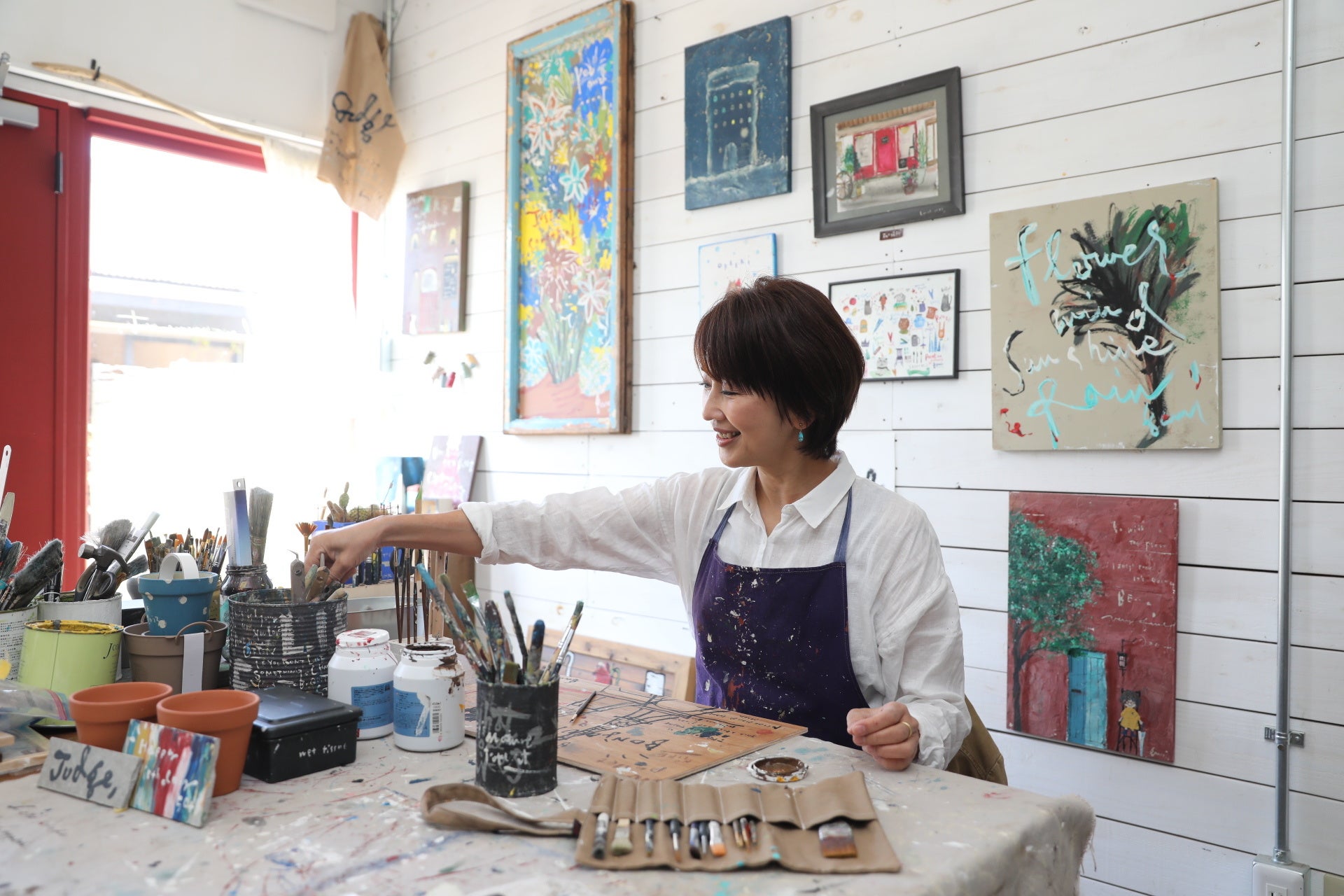 らくがき好きが高じてペインター。念願のアトリエを構え、製作に励む日々。独学で研鑽を積んだ独特の筆致の「gami文字」と「gami絵」でファンが増え、企業とのコラボレーションも多数。作品はアトリエ(p38)とプロデュースしたカフェ(p20)、そしてイベントにて販売。持ち込まれた思い出の品にらくがきを施すパフォーマンスも人気。